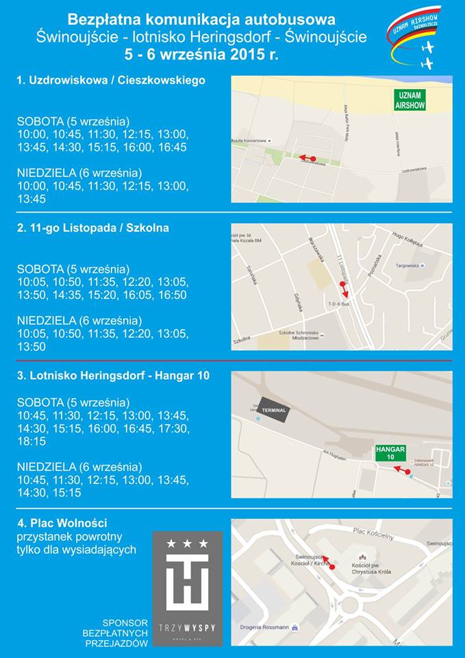 Na trasie: promenada nadmorska (przystanek Uzdrowiskowa/Cieszkowskiego) – lotnisko Heringsdorf będzie kursować specjalny, bezpłatny autobus komunikacji miejskiej. Wejście na teren muzeum Hangar 10 będzie płatne jak w normalny dzień.