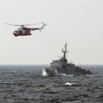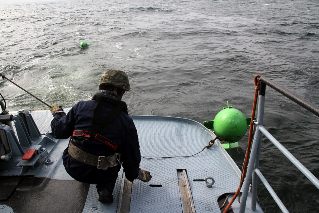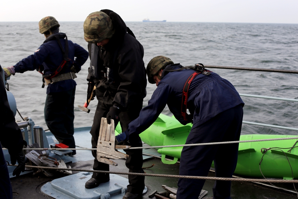 WARGACZ-15 zadania na morzu; foto Marcin PURMAN (4)Morska faza ćwiczenia zaczęła się tuż po północy. Okręty pod osłoną nocy opuściły Port Wojenny w Świnoujściu w trybie alarmowym. Już po wyjściu ćwiczyły one elementy osłony szlaków komunikacyjnych. Trałowce wykonały strzelania artyleryjskie do celów nawodnych i powietrznych, a następnie poszukiwały min za pomocą trałów oraz stacji hydrolokacyjnych. Na pokłady okrętów transportowo – minowych załadowano miny, które następnie zostały postawione na wodach Zatoki Gdańskiej. Wspólnie ze śmigłowcem Mi-14 PŁ/R z Brygady Lotnictwa MW przeprowadzono akcje ratownicze – poszukiwano rozbitka, z pokładu ćwiczącego okrętu ewakuowano na ląd rannego. Poza zadaniami specjalistycznymi załogi okrętów walczyły z pożarem oraz z przebiciem kadłuba realizując zadania obrony przeciwawaryjnej. W tym samym czasie jednostki brzegowe flotylli wspierały oraz zabezpieczały logistycznie ćwiczące na morzu jednostki. Saperzy z 8. Batalionu Saperów zorganizowali tymczasową przeprawę przez rzekę Dziwna w Dziwnowie, a w Porcie Wojennym w Świnoujściu odbyło się ćwiczenie przeciwpożarowe.