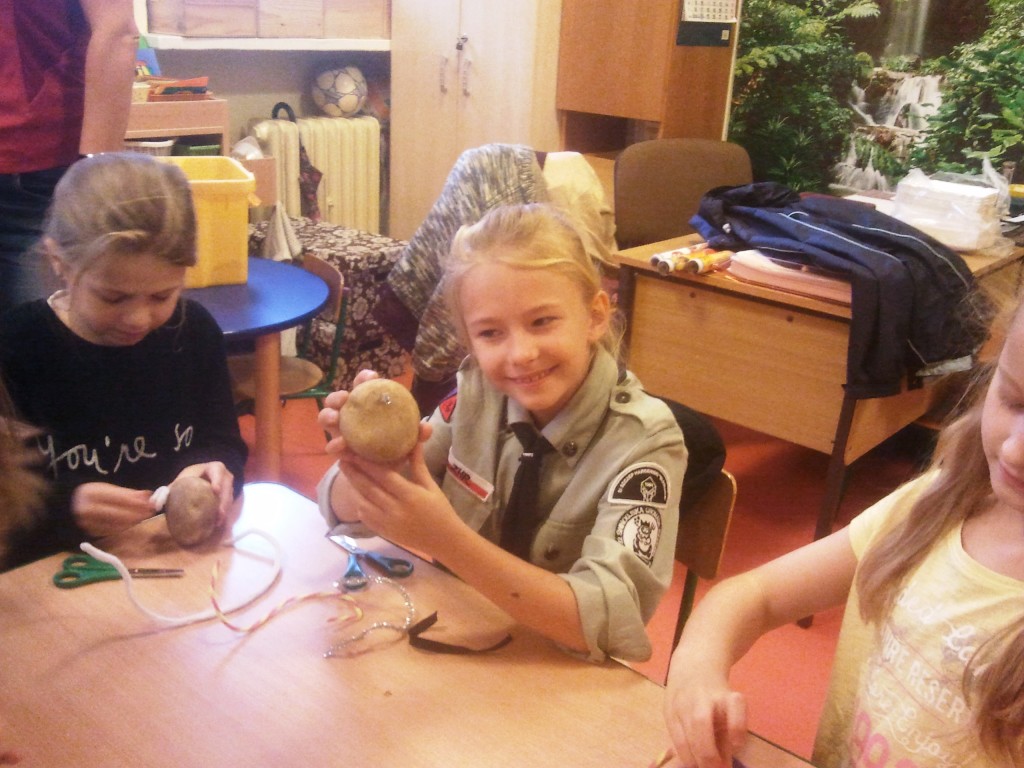 Po pląsie o ziemniaku, który bardzo lubił pić napój gazowany i jeść lody, przyszedł czas na stworzenie ziemniaków cudaków. Korzystając z materiałów zgromadzonych w przedszkolnej „skrzyni skarbów” ( koraliki, guziki, wykałaczki, włóczkę, tkaniny, tasiemki, koronki, sznurek, taśma samoprzylepna, sosnowe igły, jarzębinę, liście, bibułę, folię, plastelinę itd. ) przedszkolaki wraz z rodzicami tworzyli najróżniejsze figurki z ziemniaków. Gotowe prace zostały umieszczone razem na wystawce.