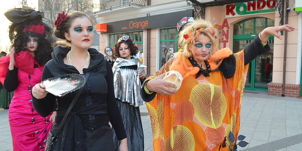 Straszydła upiory, wampiry, kościotrupy, sok z żuka i mnóstwo krwi. Ośrodek Działań Teatralnych przy Miejskim Domu Kultury po raz kolejny zorganizował zzaświatowy pokaz mody. Kilkanaście mrocznie ubranych osób przeszło ulicą Konstytucji 3 maja na Pl. Wolności wywołując uśmiech u przechodniów.