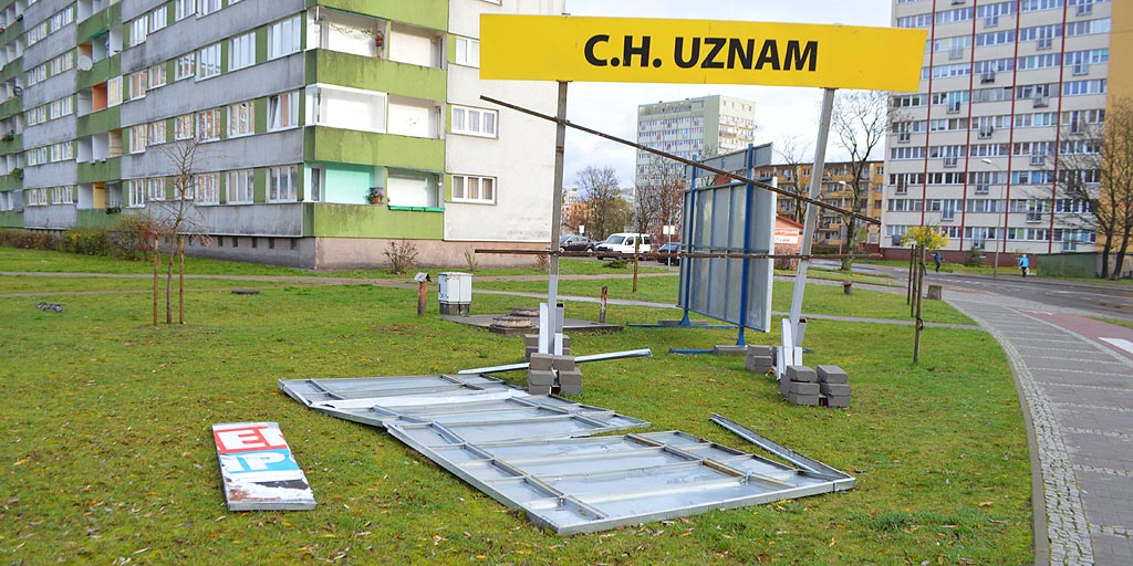 Osoby ustawiające wielkie metalowe reklamy na własnoręcznie robionych konstrukcjach, zdają się nie mieć oleju w głowie. Nie tak dawno temu ostrzegaliśmy, że reklama jednego ze sklepów w Centrum Handlowym Uznam wkrótce runie na ziemię. Nie trzeba było długo czekać. We wtorek nad ranem silny porywisty wiatr połamał metalową konstrukcję jak zapałkę. Ostrzegaliśmy, że do takiej sytuacji może dojść. Osoby odpowiedzialne za ustawienie reklamy, którą dodajmy – w przeszłości już przynajmniej jeden raz upadała, zdaje się świadomie sprowadzają zagrożenie na ludzi.