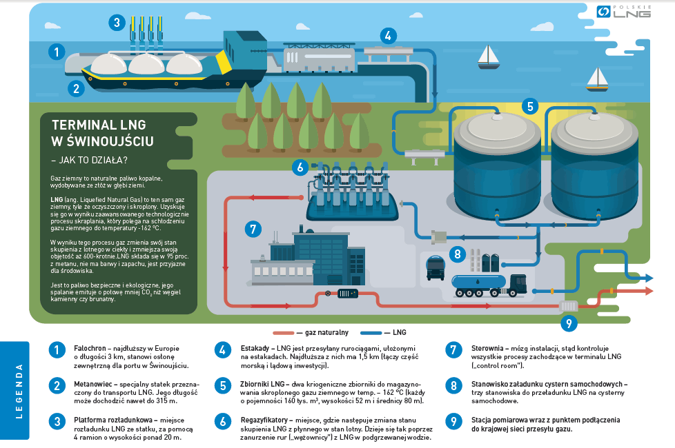 Wydobycie, skroplenie, transport i regazyfikacja LNG to skomplikowany proces, wymagający zastosowania najnowocześniejszej techniki. Droga LNG zaczyna się na polach gazowych Kataru (stamtąd gaz będzie trafiał do Świnoujścia), Algierii czy Nigerii, a kończy w wielkich terminalach Azji i Europy. Idealną czystość gazu uzyskuje się w procesie skraplania, który odbywa się w specjalnych terminalach LNG, do których gaz naturalny, w postaci lotnej, dostarczany jest z pól gazowych. Istnieją trzy podstawowe metody skraplania. W skrócie polegają one na ochładzaniu gazu puszczonego pod odpowiednim ciśnieniem i oczyszczonego z dwutlenku węgla i wody. W terminalu skraplającym gaz zostaje schłodzony do temperatury wrzenia metanu, czyli -162⁰C, a następnie z wielkich zbiorników kriogenicznych przepompowany do metanowców. Największe z nich – Q-Max – zabierają nawet 266 tys. m sześc. gazu, nieco mniejsze – Q-Flex, które będą przywoziły LNG do Świnoujścia – 216 tys. m sześc. Po dostarczeniu na miejsce ciekłe paliwo jest przesyłane rurociągami do specjalnych zbiorników (w świnoujskim terminalu są takie dwa). Potem LNG jest poddawany procesowi regazyfikacji, czyli ponownego przekształcenia w gaz w postaci lotnej. Dokonuje się tego poprzez ogrzanie surowca w stanie ciekłym. Następnie gaz przesyłany jest gazociągami do odbiorców… i wtedy na stole pojawia się gorąca herbata, w wannie ciepła woda, a z grzejników bije przyjemne ciepło…
