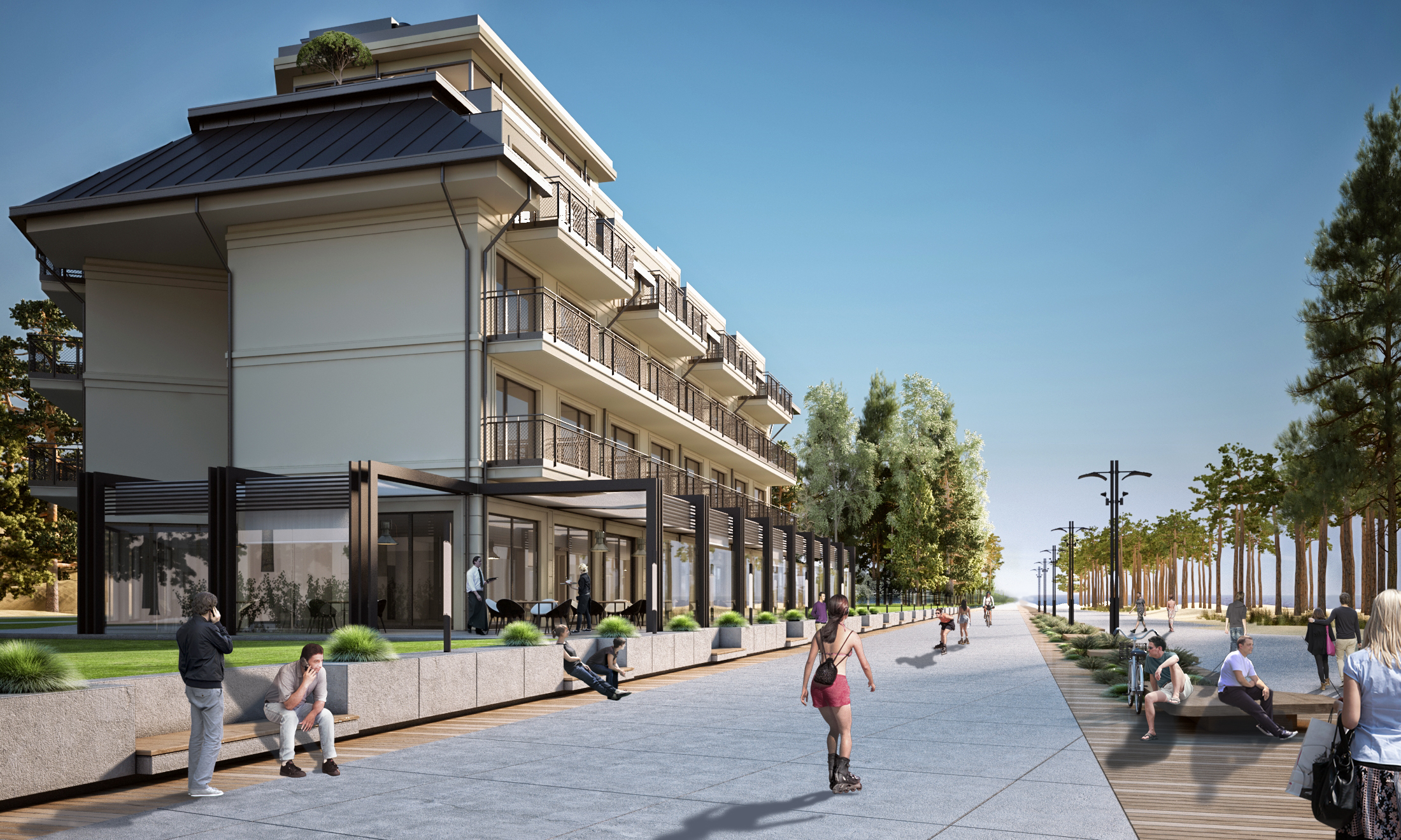 Jak widać na wizualizacji w każdym budynku będą sklepy i restauracje. Aby w bardzo wysokich cenach wynająć te lokale – to potrzebna była działka z dojściem z promenady wprost do morza.