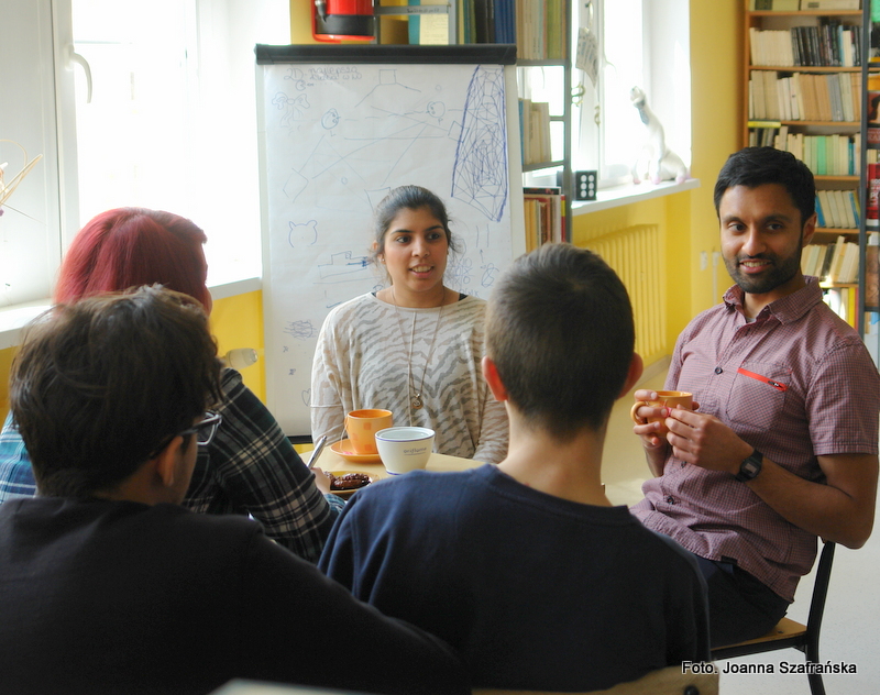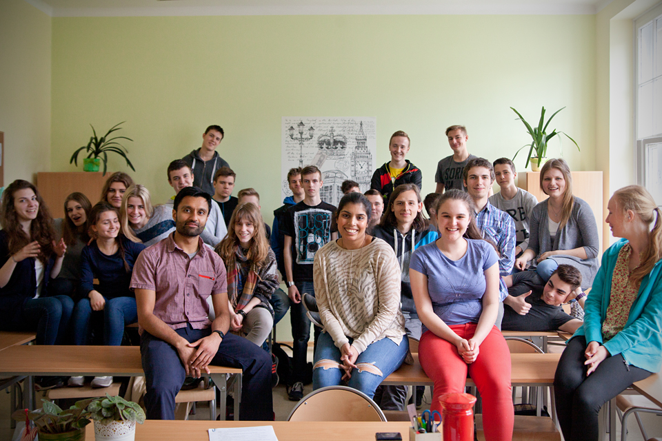 DSC07117-001W dniu 25 kwietnia cała szkoła, dosłownie wszystkie klasy, miały na wybranych lekcjach spotkania z gośćmi Olgi, wśród których byli Wenezuelka, Kanadyjka  pochodzenia czeskiego i singapurskiego, Australijczyk, Kanadyjczyk szwedzkiego pochodzenia, Holender, Paragwajka, Amerykanka pochodzenia wietnamskiego, dwoje Brytyjczyków pochodzenia hinduskiego oraz dwoje Polaków z dawnej licealnej klasy Olgi: Magda i Igor. W sumie 12 osób. Opowieściom o tym „jak spotkali Olgę”, jaka była ich życiowa ścieżka do tej pory i dokąd ich prawdopodobnie jeszcze poprowadzi nie było końca. Nasi goście byli bardzo różni od siebie pod względem kultury z której się wywodzą, ale łączył ich wszystkich uśmiech, optymizm, wielka radość życia, upodobanie do podróży i niezwykłych przygód, odwaga w podejmowaniu wyzwań i…. często oryginalny sposób zarabiania na życie.