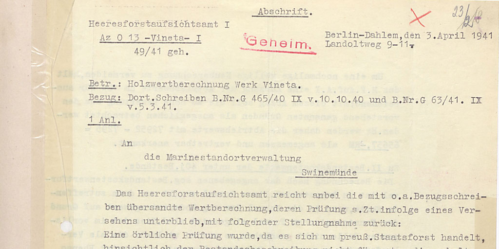 „Warto zauważyć, że wymienione w zestawieniu dęby mają więcej niż 40 lat. Przedstawiona wycena odnosi się do drzew starszych niż 30 lat, dlatego korekta przedstawiona przez (…) Krigsmarine jest nie do zaakceptowania.”- można przeczytać w jednym z pism dotyczących baterii Vineta. „Las ma dużą wartość produkcyjną, dlatego sugerujemy wyłącznie z terenu wskazanego w piśmie (…) o starodrzew zlokalizowany po północnej stronie działki” – czytamy w innym dokumencie, który pochodzi ze zbioru dotyczącego nowych koszar marynarki.