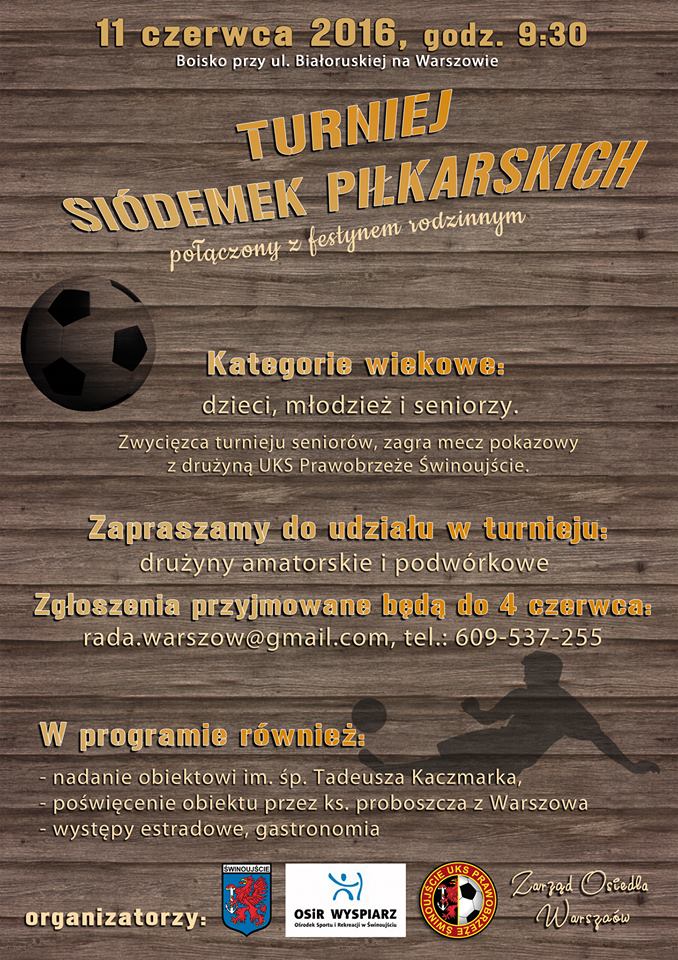 W imieniu Zarządu Osiedla Warszów zapraszamy na imprezę która odbędzie się 11.06.2016 przy boisku na ulicy Białoruskiej. W programie oficjalne otwarcie boiska przez Prezydenta Janusza Żmurkiewicza, nadanie mu imienia Tadeusza Kaczmarka, odkrycie tablicy pamiątkowej.