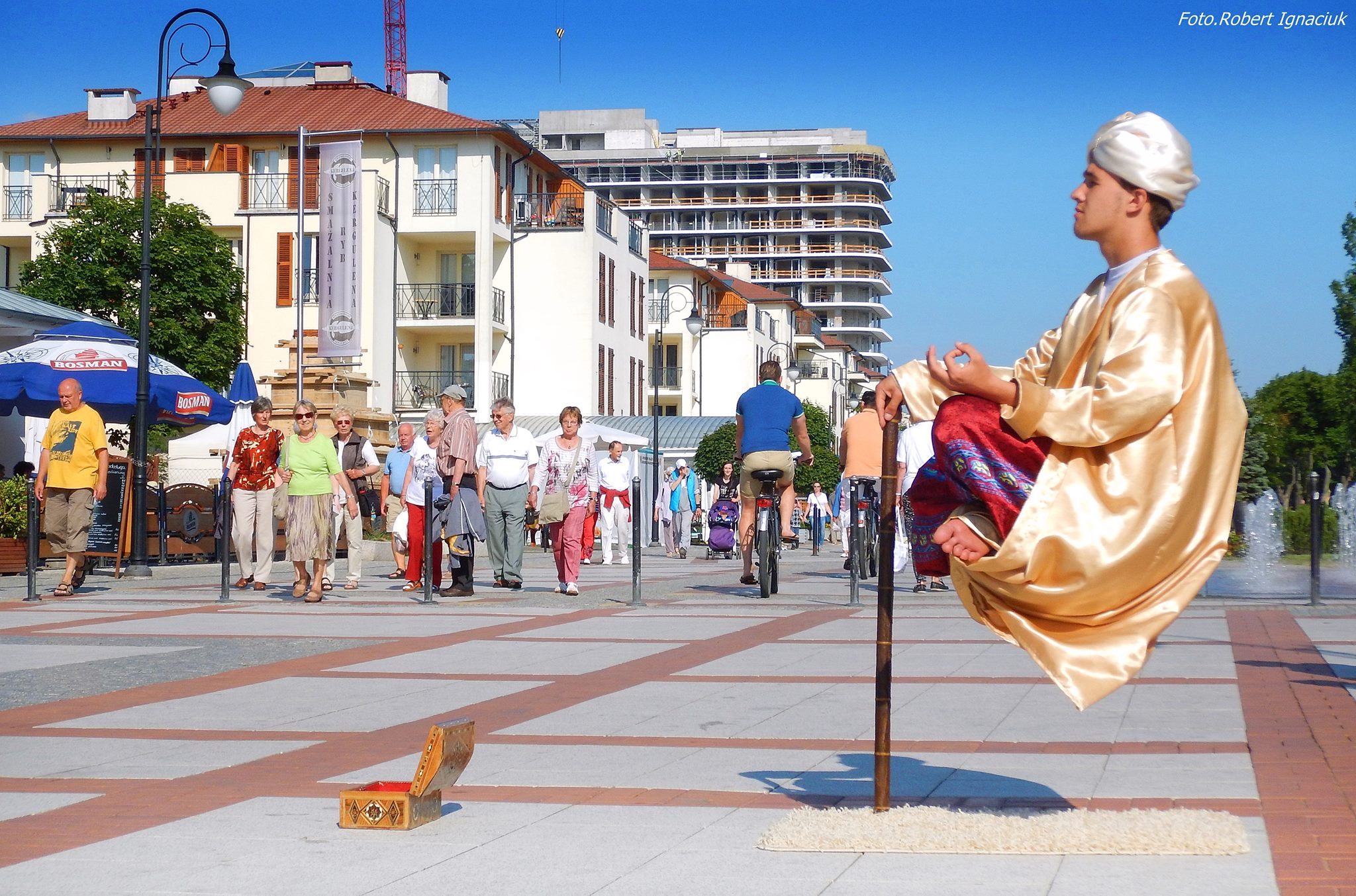 Magik lewituje nad świnoujską promenadą. W skupieniu potrafi wytrwać przez kilkanaście godzin. Chyba, że jest bardzo upalnie, wówczas potrzebuje chwili odpoczynku, aby napić się wody. Magik unosi się nad dywanem.