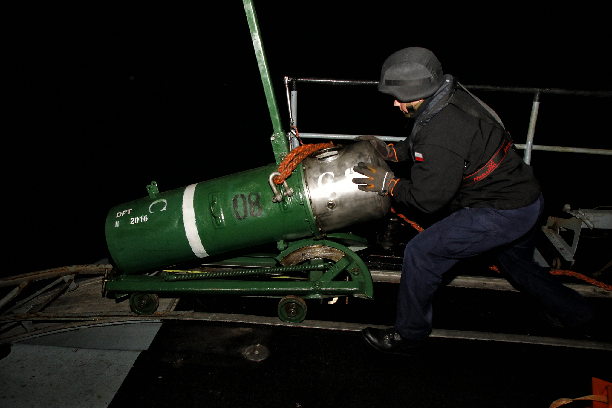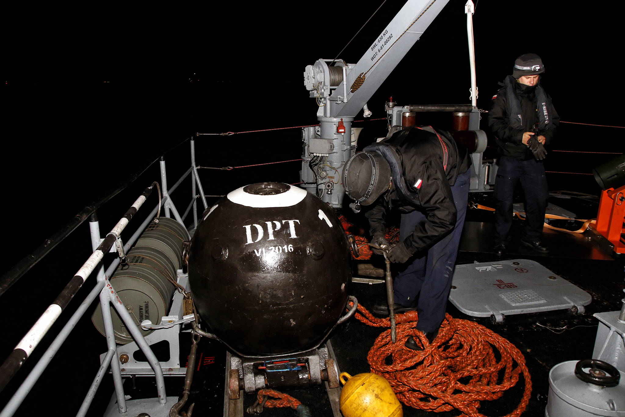 1592W nocy z poniedziałku na wtorek (7/8 czerwca ) okręty 8.FOW zorganizowane w grupę wykonały zadania minowe na wodach Zatoki Pomorskiej. W ramach ćwiczenia Anakonda-16 okręty postawiły zagrodę minową. Zagroda taka postawiona została z kilkunastu min. Ćwiczenie to odbywało się w nocy, aby wykorzystać ciemność jako element maskujący działania, dodatkowo okręty wykonywały to zadanie w ogólnym zaciemnieniu – z zasłoniętymi bulajami oraz przy wykorzystaniu minimalnego oświetlenia. Pomimo, że operacje minowania prowadzone są w całkowitych ciemnościach, miny muszą być postawione bardzo precyzyjnie. Każda z nich ma dokładnie określoną pozycję w zagrodzie, w której musi zostać postawiona, tak aby była ona skuteczna. Przy zespołowym stawianiu min konieczne jest dokładne skoordynowanie działań okrętów, tak aby zachować bezpieczeństwo wykonywania zadania przy zachowaniu obliczonych parametrów założonej zagrody minowej.