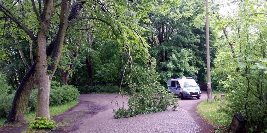 Wiatr złamał gałąź drzewa rosnącego przy ulicy Jachtowej. W każdej chwili mogła runąć na przejeżdżające po drodze samochody. Policjanci zabezpieczyli miejsce do przyjazdu strażaków.