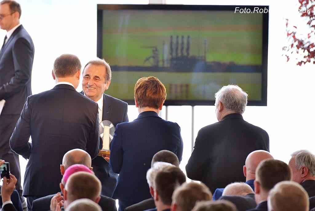 Podczas ostatniej uroczystości w której wzięła udział głowa państwa, Andrzej Duda otrzymał od prezydenta Janusza Żmurkiewicza także wiatrak – symbol miasta. Na szczęście w nieco lepszym wykonaniu. Foto: Robert Ignaciuk