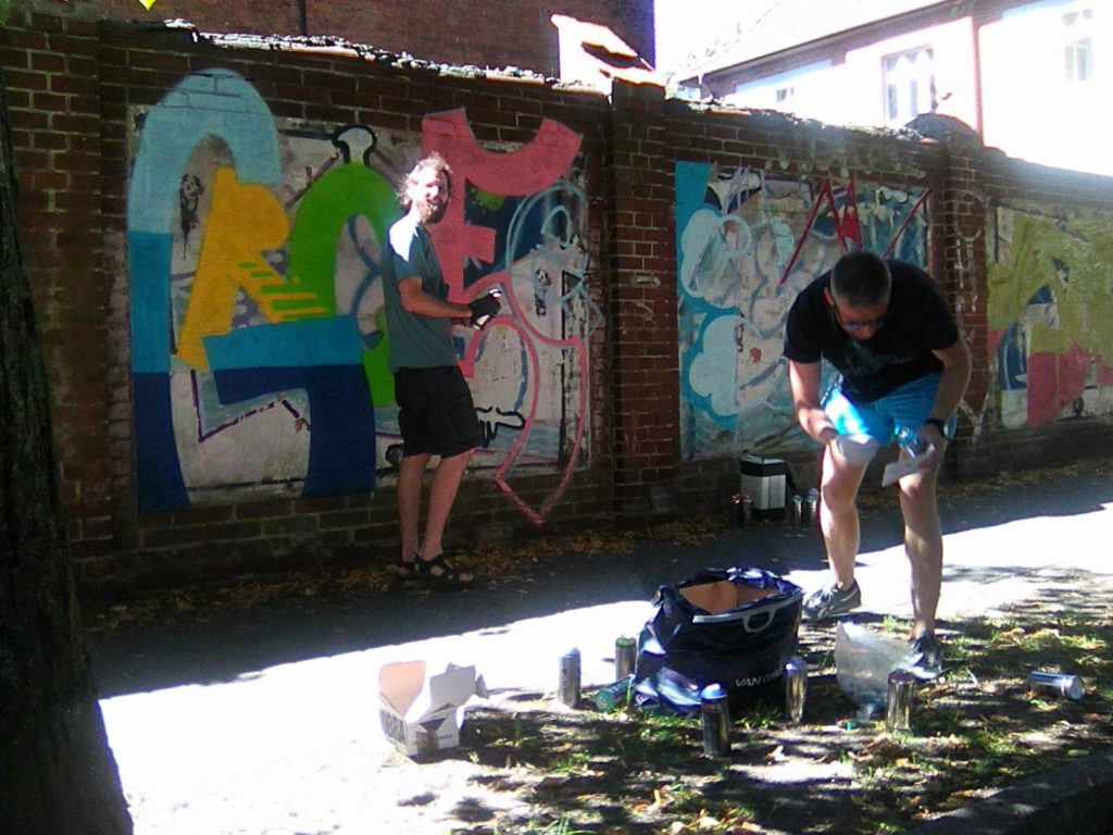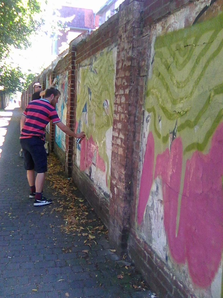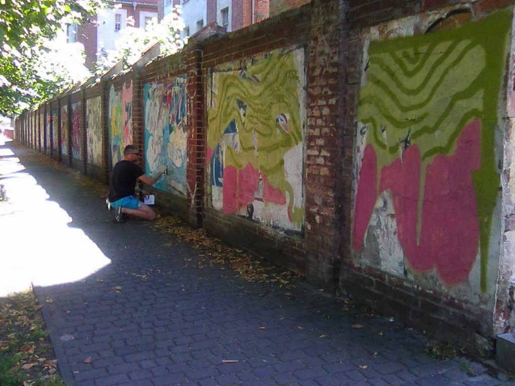 Ogrodzenie budynku dawnego koszarowca przy ul. Wyspiańskiego nie jest piękne. Mur od wielu lat stoi pobazgrany. Artyści, którzy przyjechali na Famę postanowili go trochę ożywić.
