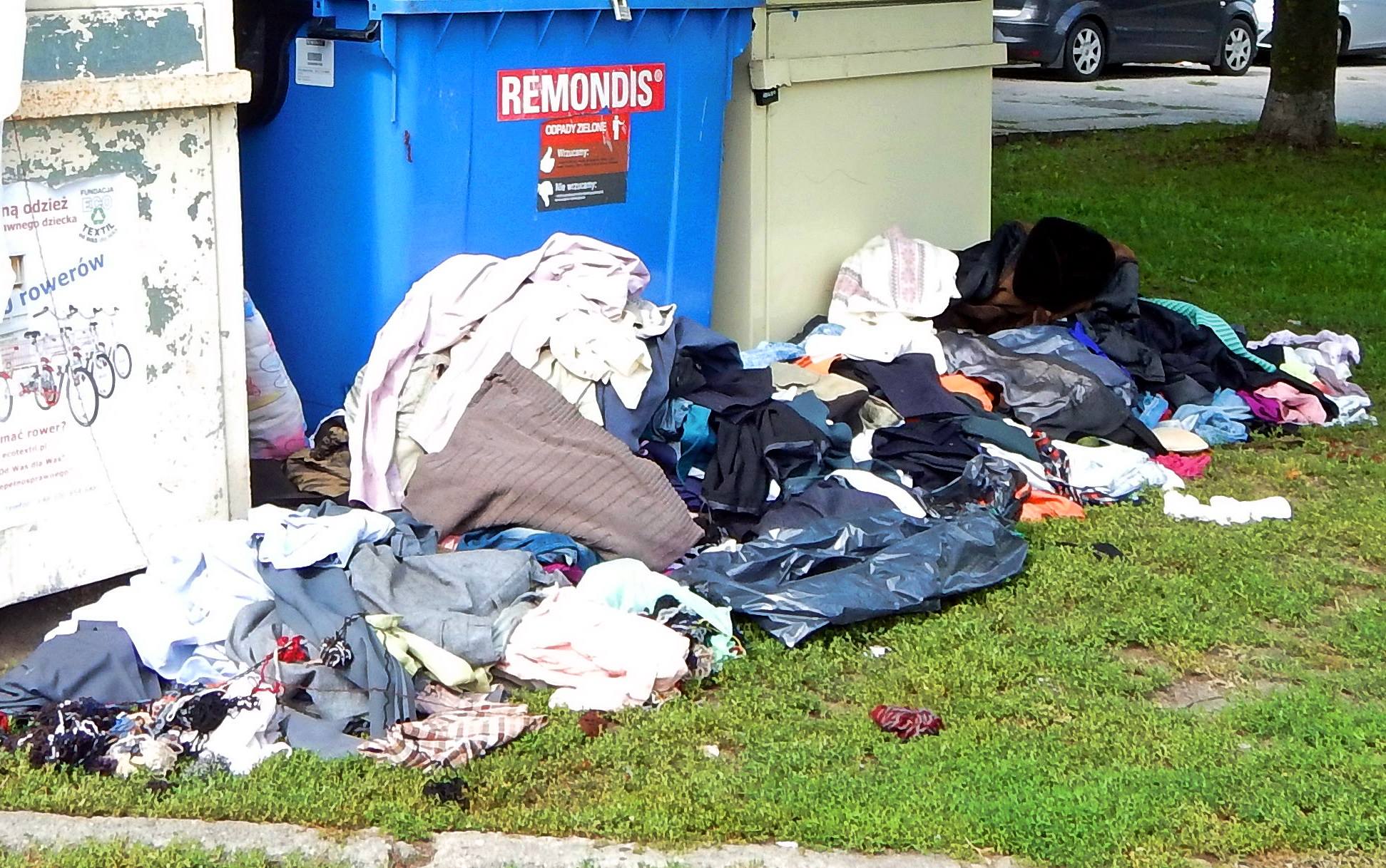 Pomiędzy blokami przy ulicy Grunwaldzkiej porozrzucane są ubrania. Wszystkiemu winni są bezdomni, którzy plądrują metalowe pojemniki na używaną odzież. Opracowali sposób wyjmowania ubrań ze środka. Wybierają te, które im się podobają, a resztę wyrzucają.