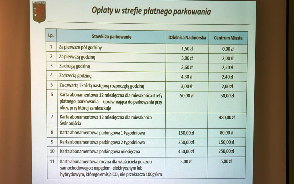 Pierwsze pól godziny postoju byłoby bezpłatne, za pierwszą godzinę postoju proponowana opłata wynosiłaby 2 złote, za drugą 2,20, za trzecią 2,40, a za czwartą i każdą kolejną 2 złote. Według projektu, strefa w centrum obowiązywałaby od poniedziałku do piątku w godzinach 8.00 – 18.00, a w dzielnicy nadmorskiej od 8.00 do 20.00. W obu strefach w soboty, niedziele i dni świąteczne parkowanie byłoby darmowe.