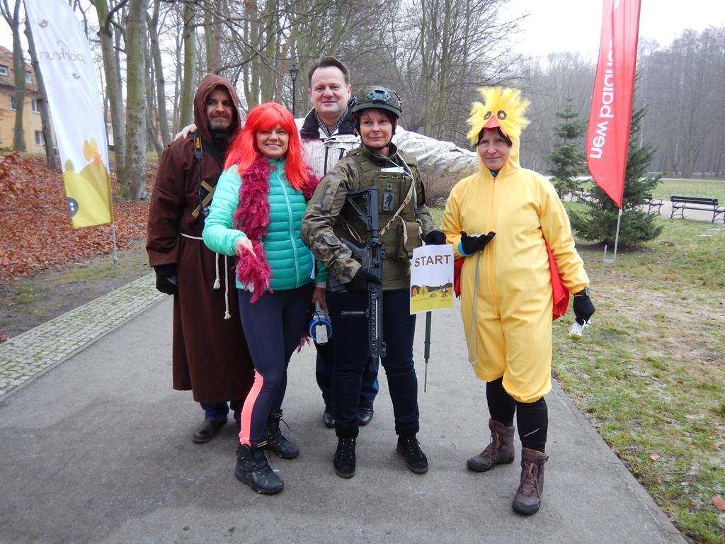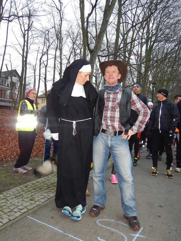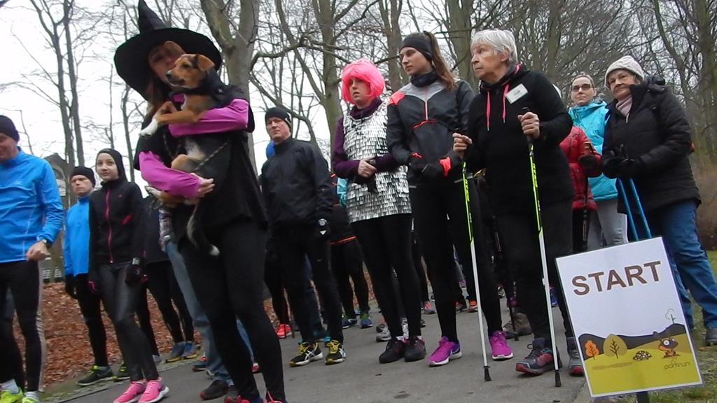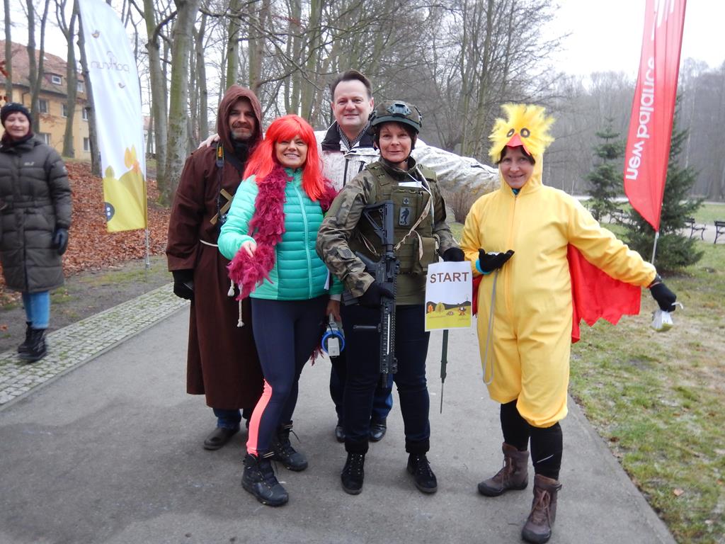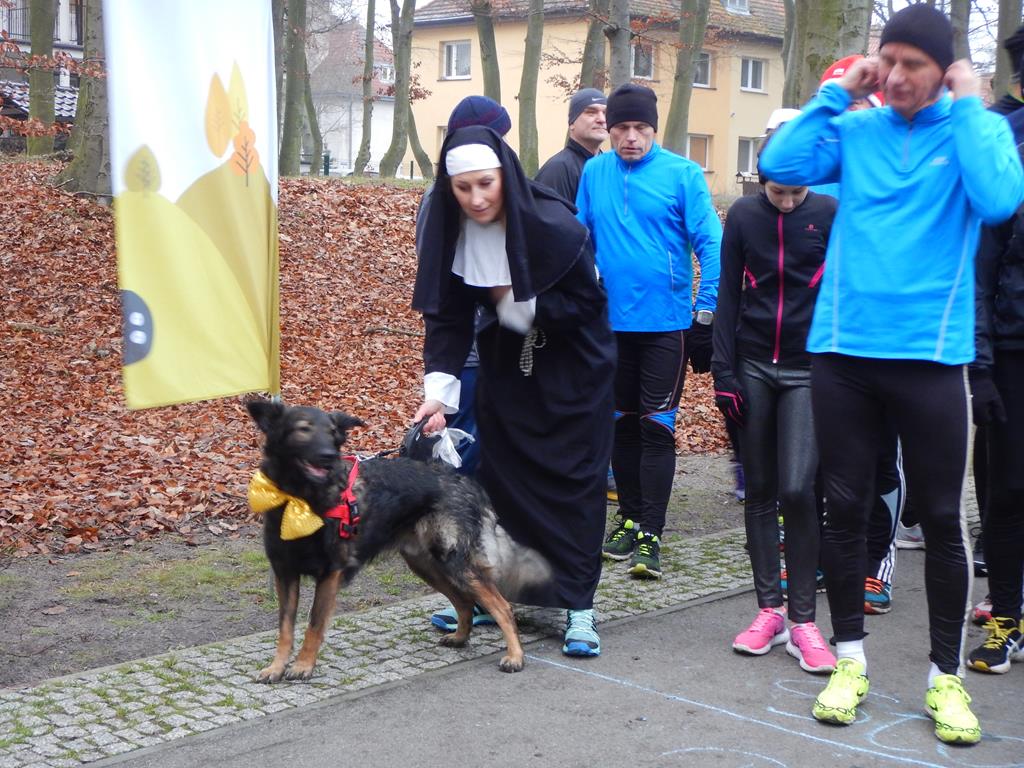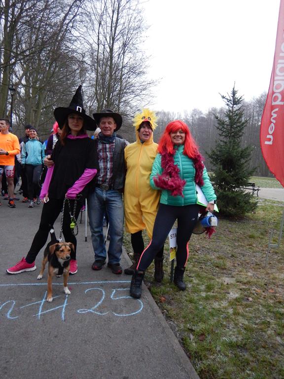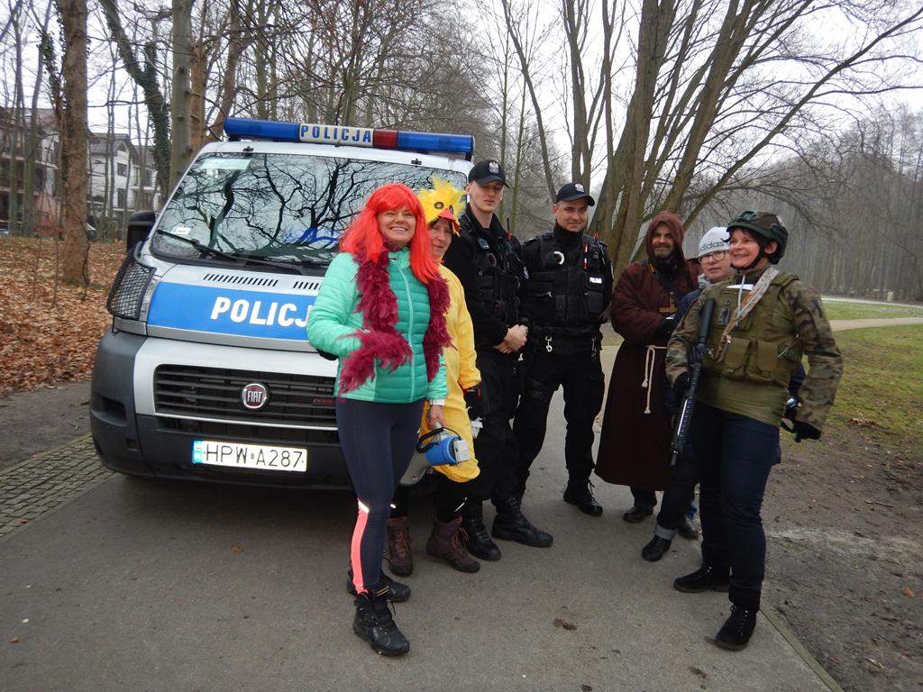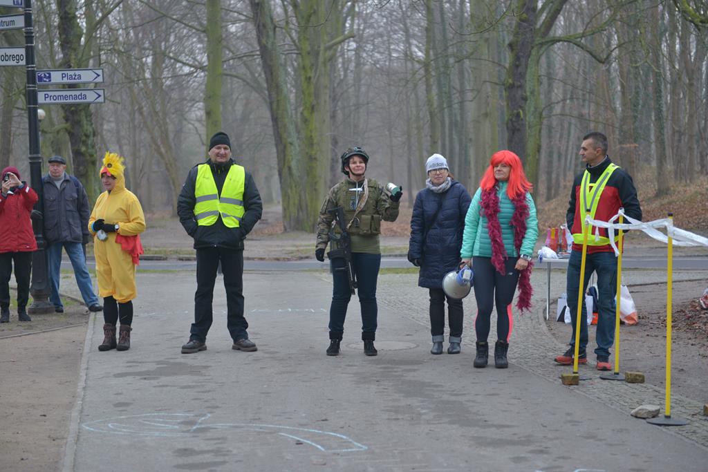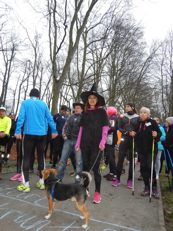 Na starcie stanęło 68 osób i cztery czworonogi i rower bezpieczeństwa, czyli Joanna Bilard. Fotoreporterzy, których było wielu, mieli swoją chwilę, aby uwiecznić ten szczególny moment, ale biegacze byli dzisiaj wyjątkowo rozgadani, rozbawieni i niesforni i jakoś trudno im było stanąć do wspólnego zdjęcia, a było co fotografować. Na bieg zagościł kurczak, groźny niedźwiedź, zakonnica, mnich, kowboj, Smerfetek, radosne i kolorowe morświnki i damy z neonowymi fryzurami. Było na co popatrzeć, gdy cała barwna gromada wystartowała na znak dany przez Wiceprezydenta Miasta Pawła Sujkę. Dodatkową, choć nie zamierzoną, atrakcją już po starcie okazała się wizyta policjantów i żeby nie było”…to nie byli przebierańcy tylko polscy policjanci”.
