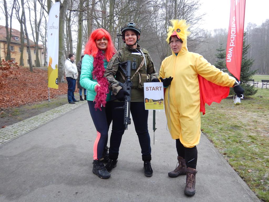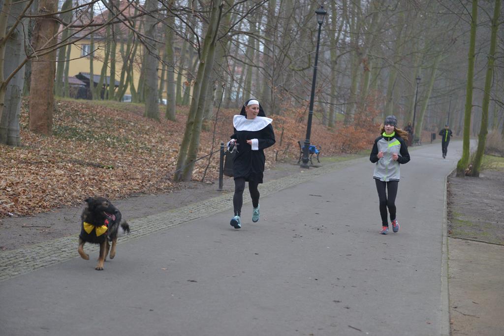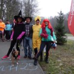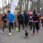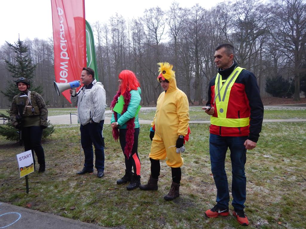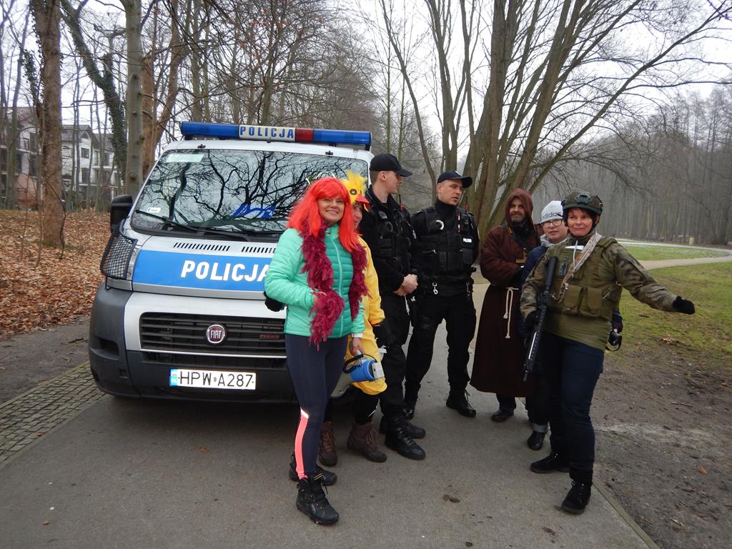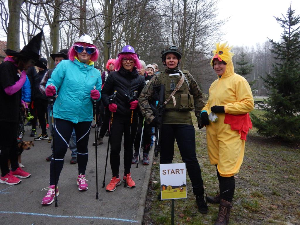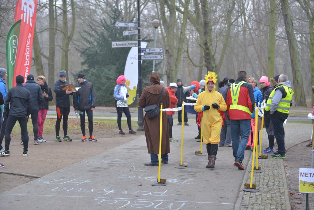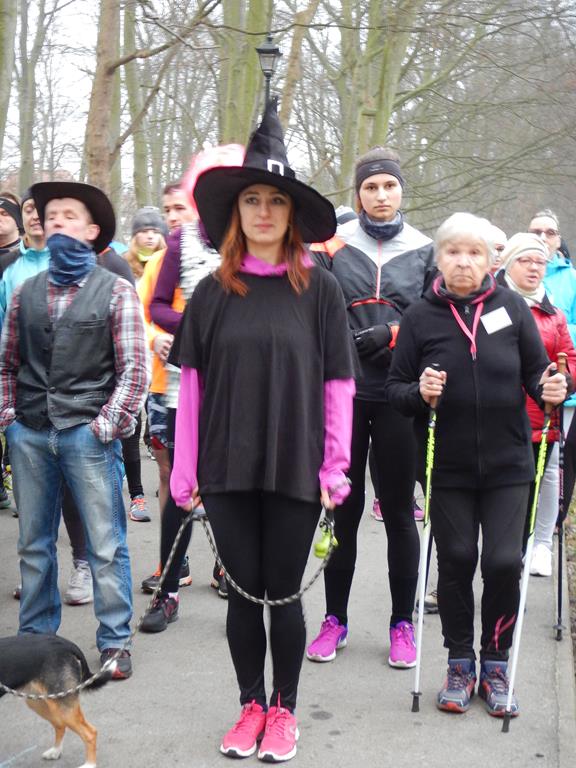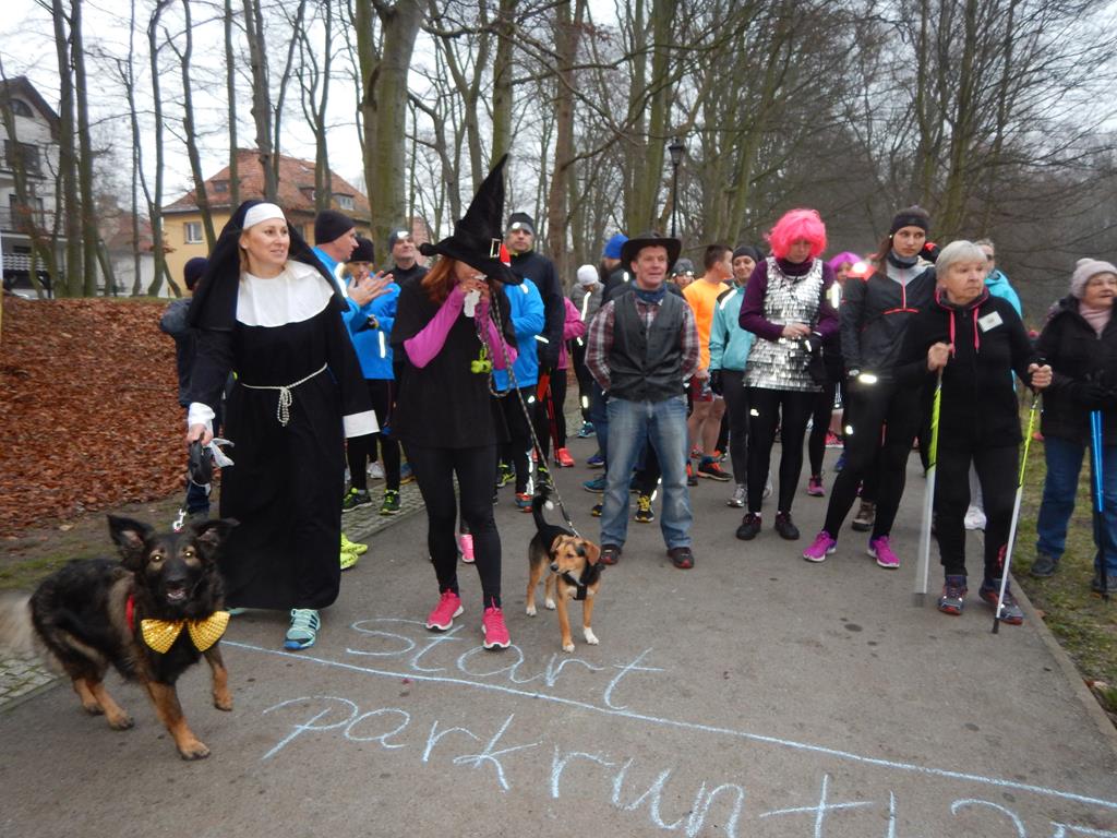 Na starcie stanęło 68 osób i cztery czworonogi i rower bezpieczeństwa, czyli Joanna Bilard. Fotoreporterzy, których było wielu, mieli swoją chwilę, aby uwiecznić ten szczególny moment, ale biegacze byli dzisiaj wyjątkowo rozgadani, rozbawieni i niesforni i jakoś trudno im było stanąć do wspólnego zdjęcia, a było co fotografować. Na bieg zagościł kurczak, groźny niedźwiedź, zakonnica, mnich, kowboj, Smerfetek, radosne i kolorowe morświnki i damy z neonowymi fryzurami. Było na co popatrzeć, gdy cała barwna gromada wystartowała na znak dany przez Wiceprezydenta Miasta Pawła Sujkę. Dodatkową, choć nie zamierzoną, atrakcją już po starcie okazała się wizyta policjantów i żeby nie było”…to nie byli przebierańcy tylko polscy policjanci”.