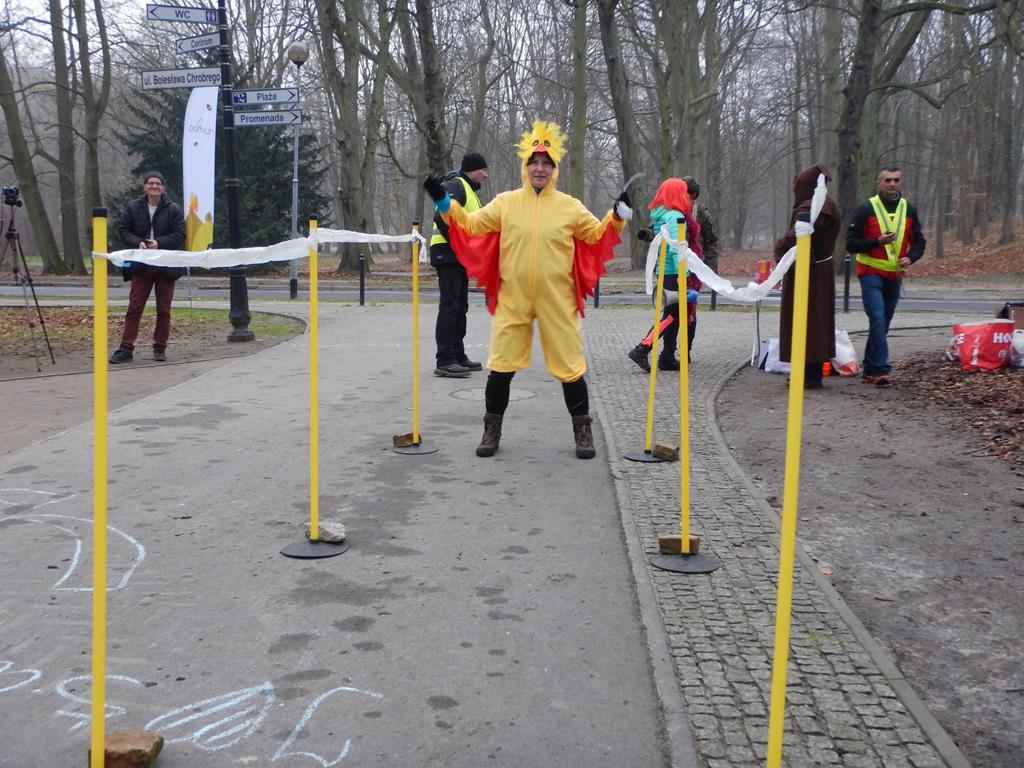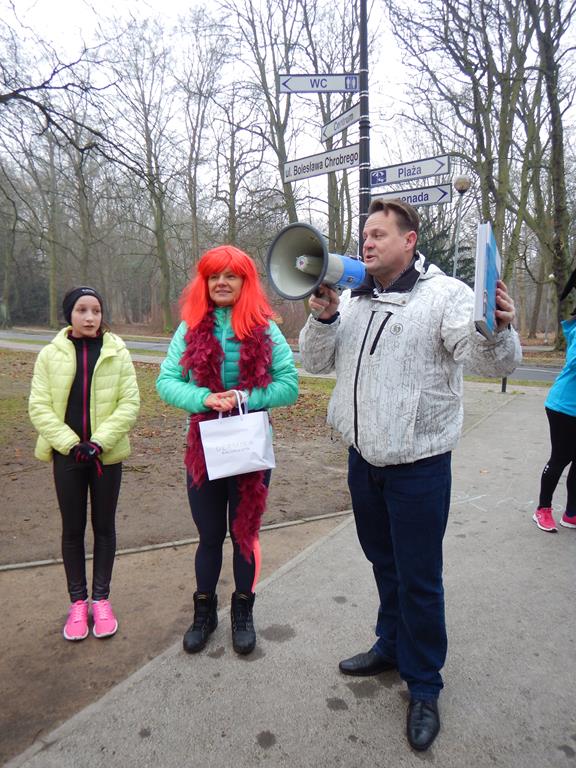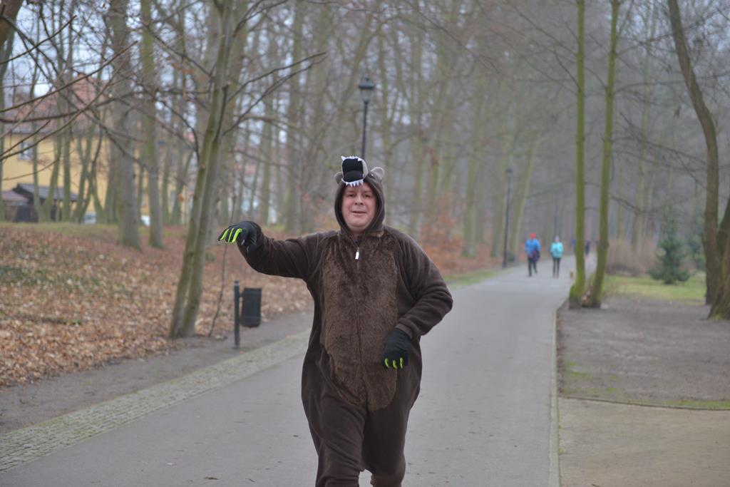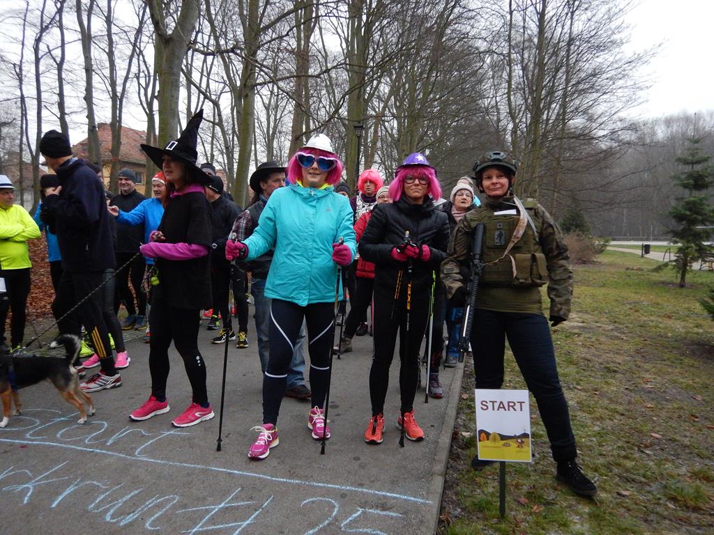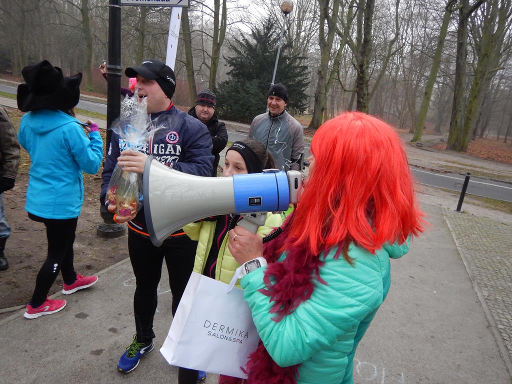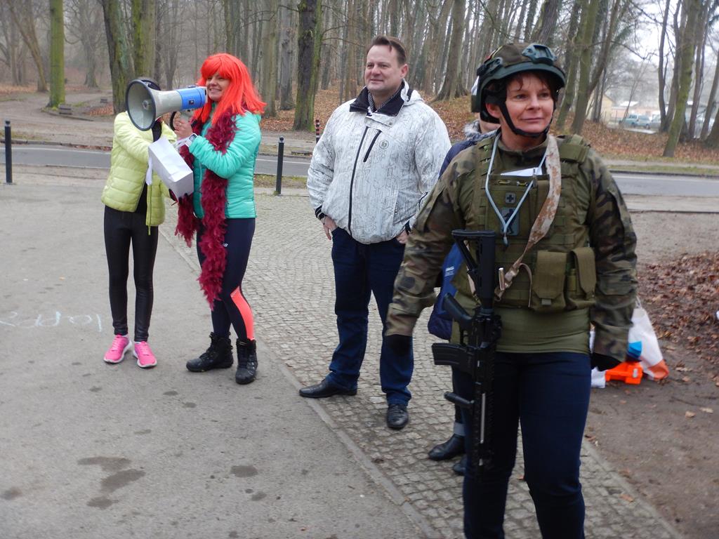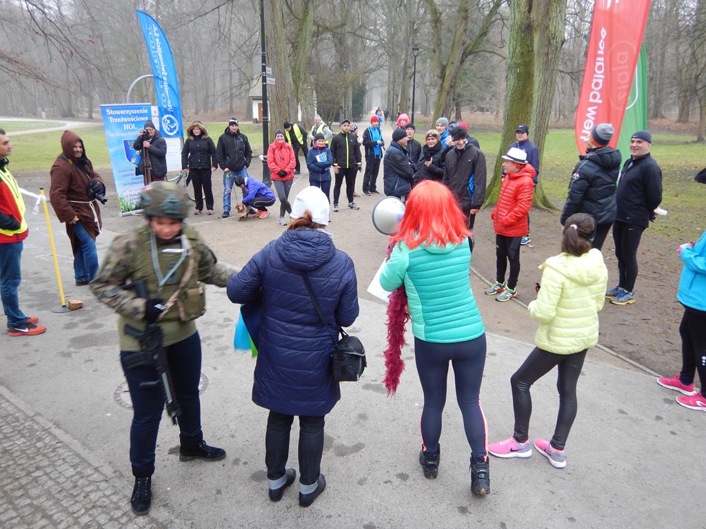 Na starcie stanęło 68 osób i cztery czworonogi i rower bezpieczeństwa, czyli Joanna Bilard. Fotoreporterzy, których było wielu, mieli swoją chwilę, aby uwiecznić ten szczególny moment, ale biegacze byli dzisiaj wyjątkowo rozgadani, rozbawieni i niesforni i jakoś trudno im było stanąć do wspólnego zdjęcia, a było co fotografować. Na bieg zagościł kurczak, groźny niedźwiedź, zakonnica, mnich, kowboj, Smerfetek, radosne i kolorowe morświnki i damy z neonowymi fryzurami. Było na co popatrzeć, gdy cała barwna gromada wystartowała na znak dany przez Wiceprezydenta Miasta Pawła Sujkę. Dodatkową, choć nie zamierzoną, atrakcją już po starcie okazała się wizyta policjantów i żeby nie było”…to nie byli przebierańcy tylko polscy policjanci”.