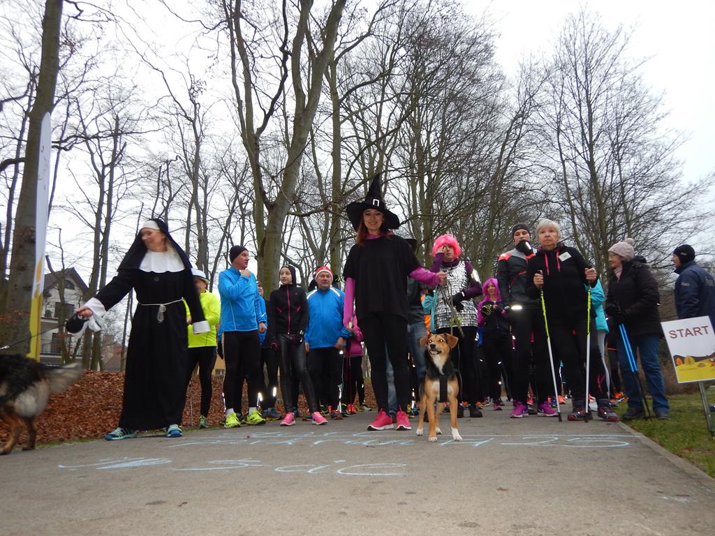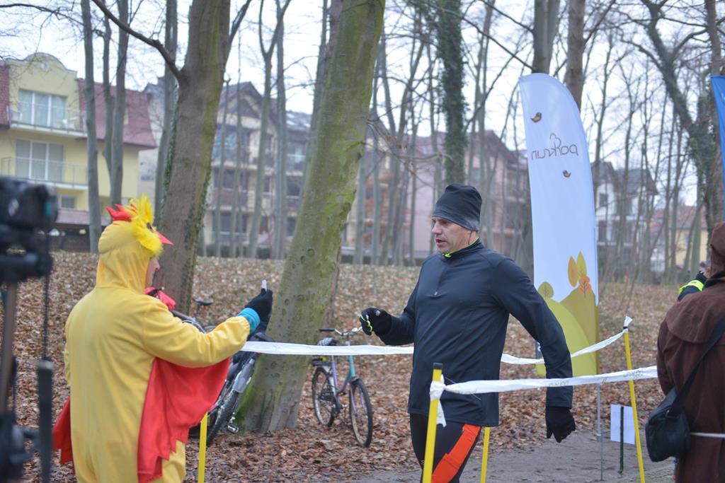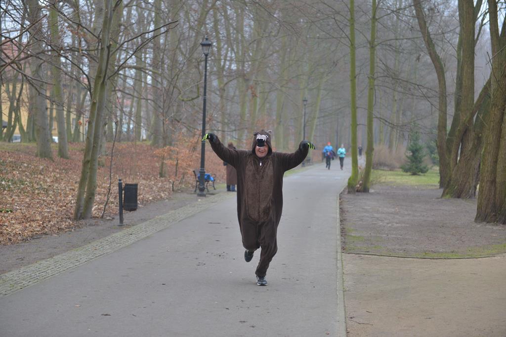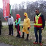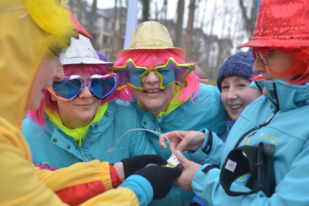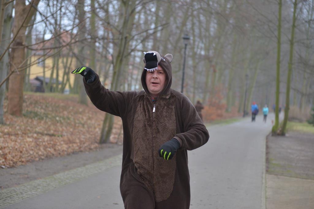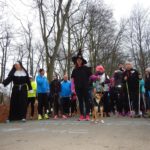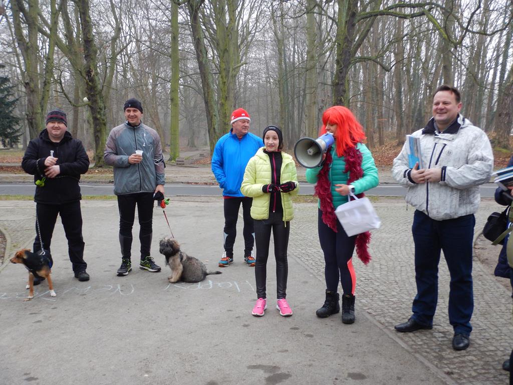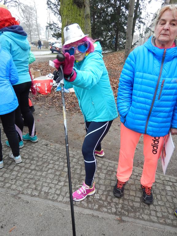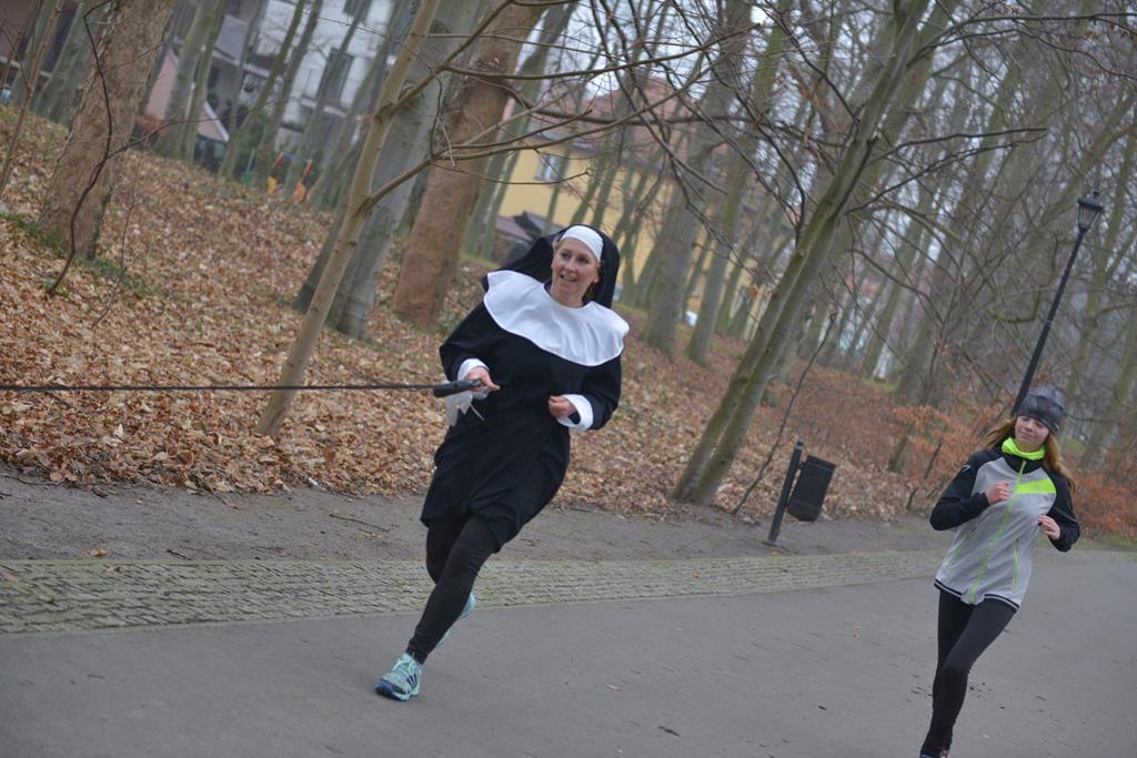 Na starcie stanęło 68 osób i cztery czworonogi i rower bezpieczeństwa, czyli Joanna Bilard. Fotoreporterzy, których było wielu, mieli swoją chwilę, aby uwiecznić ten szczególny moment, ale biegacze byli dzisiaj wyjątkowo rozgadani, rozbawieni i niesforni i jakoś trudno im było stanąć do wspólnego zdjęcia, a było co fotografować. Na bieg zagościł kurczak, groźny niedźwiedź, zakonnica, mnich, kowboj, Smerfetek, radosne i kolorowe morświnki i damy z neonowymi fryzurami. Było na co popatrzeć, gdy cała barwna gromada wystartowała na znak dany przez Wiceprezydenta Miasta Pawła Sujkę. Dodatkową, choć nie zamierzoną, atrakcją już po starcie okazała się wizyta policjantów i żeby nie było”…to nie byli przebierańcy tylko polscy policjanci”.