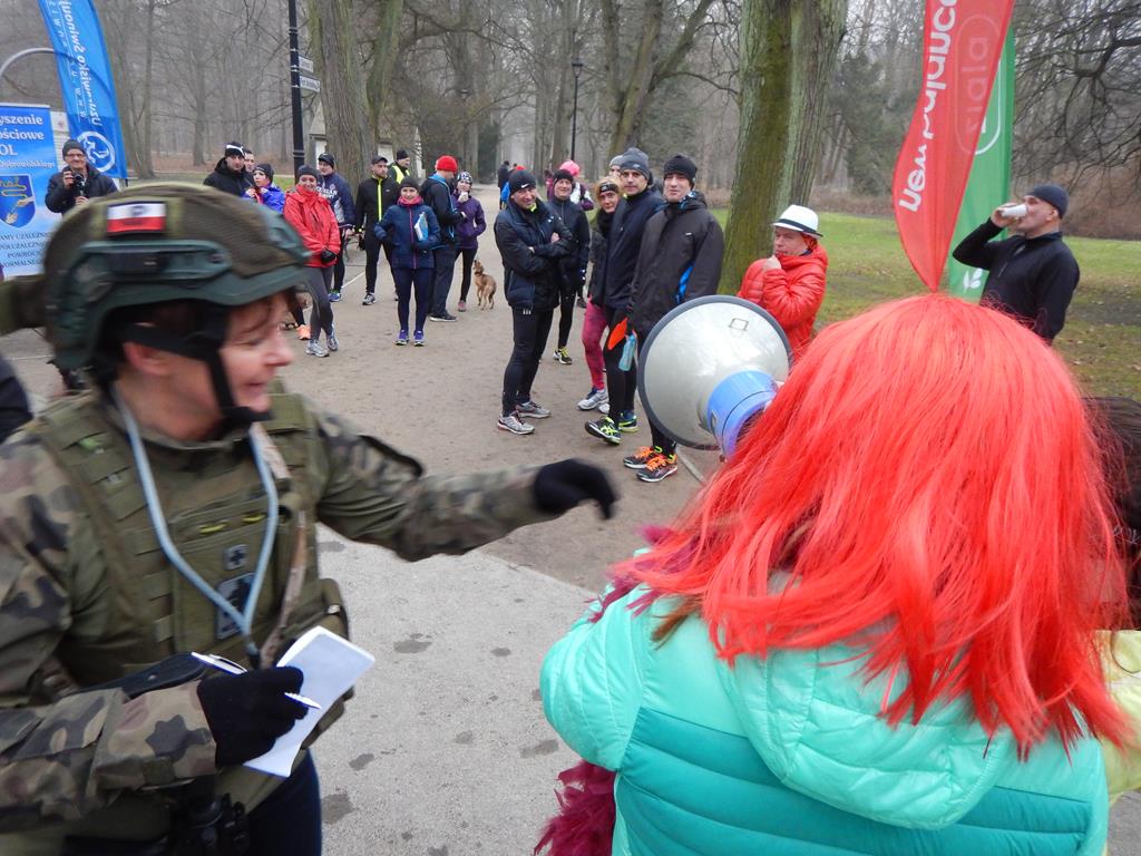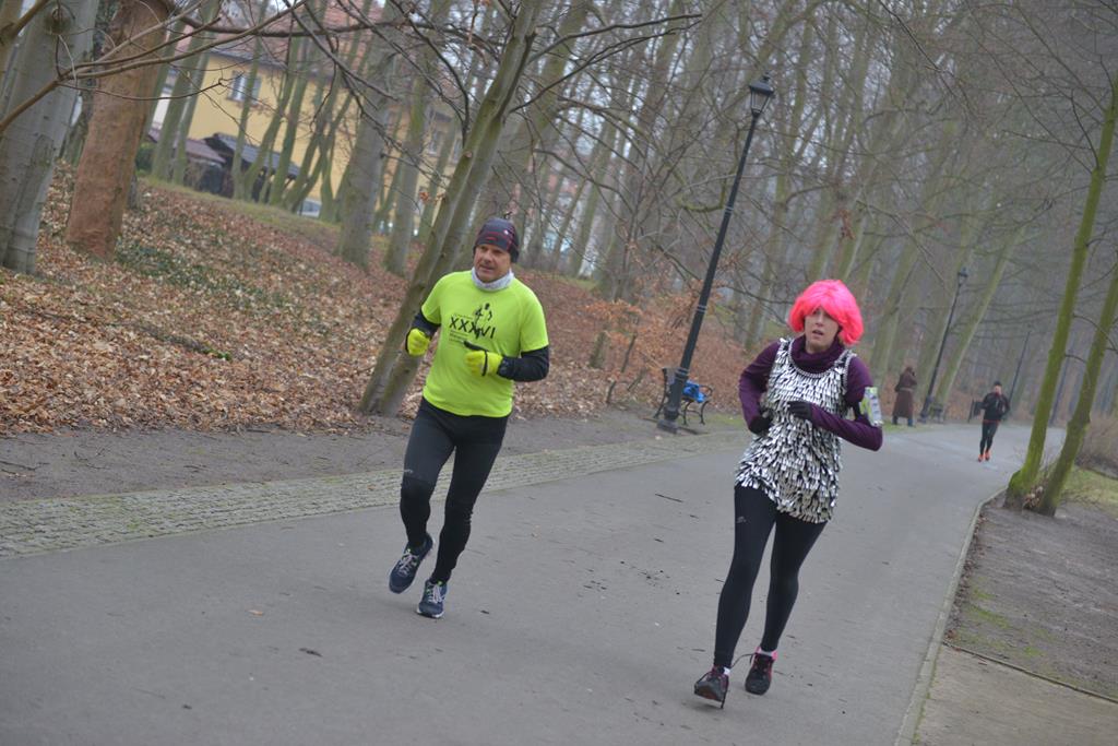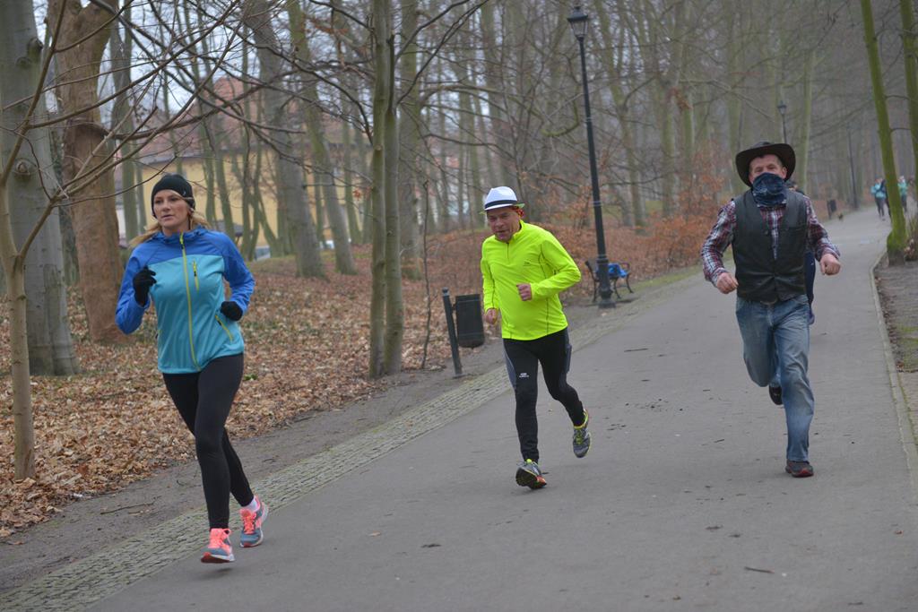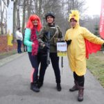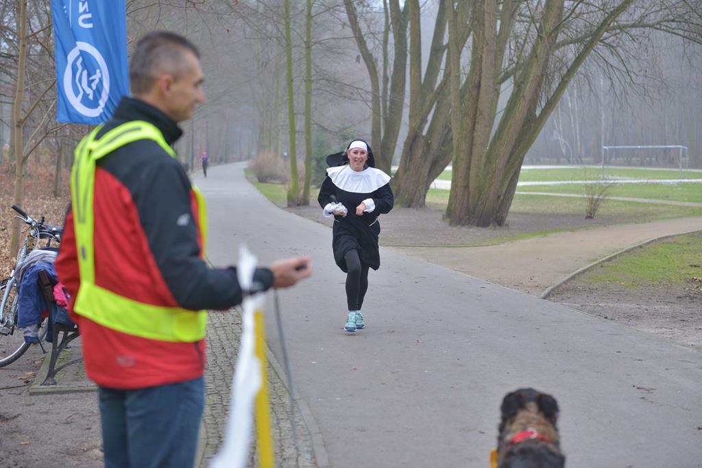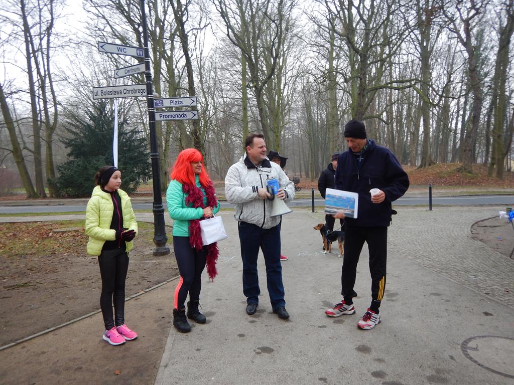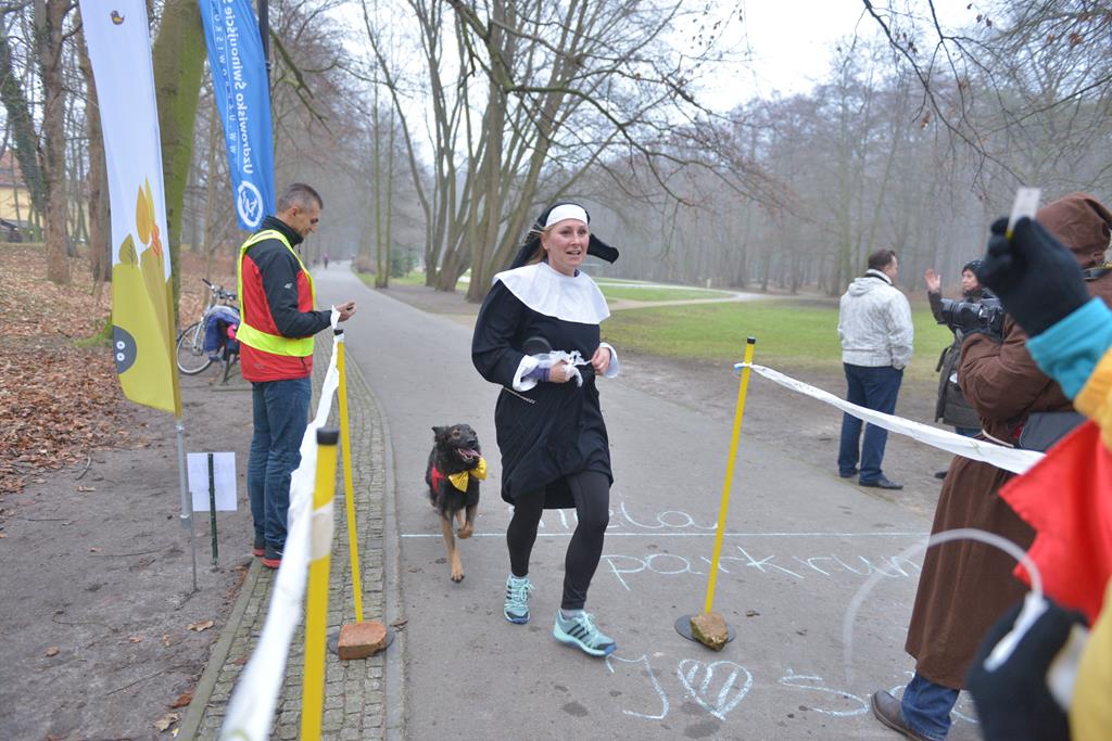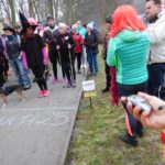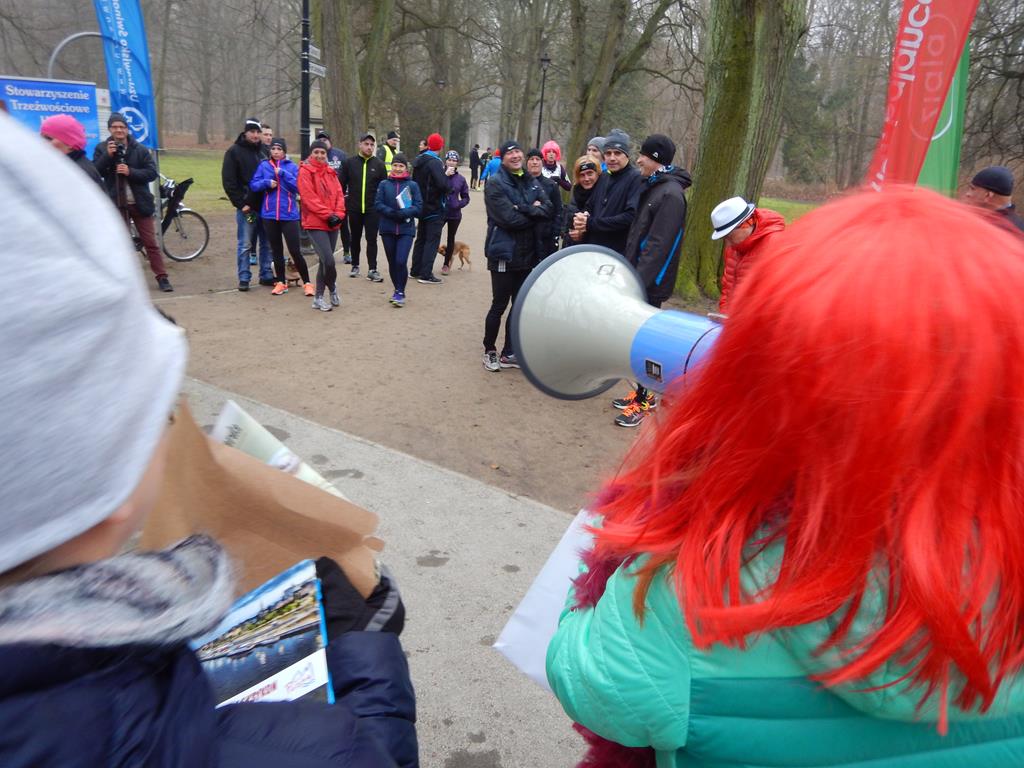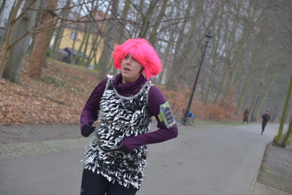 Na starcie stanęło 68 osób i cztery czworonogi i rower bezpieczeństwa, czyli Joanna Bilard. Fotoreporterzy, których było wielu, mieli swoją chwilę, aby uwiecznić ten szczególny moment, ale biegacze byli dzisiaj wyjątkowo rozgadani, rozbawieni i niesforni i jakoś trudno im było stanąć do wspólnego zdjęcia, a było co fotografować. Na bieg zagościł kurczak, groźny niedźwiedź, zakonnica, mnich, kowboj, Smerfetek, radosne i kolorowe morświnki i damy z neonowymi fryzurami. Było na co popatrzeć, gdy cała barwna gromada wystartowała na znak dany przez Wiceprezydenta Miasta Pawła Sujkę. Dodatkową, choć nie zamierzoną, atrakcją już po starcie okazała się wizyta policjantów i żeby nie było”…to nie byli przebierańcy tylko polscy policjanci”.
