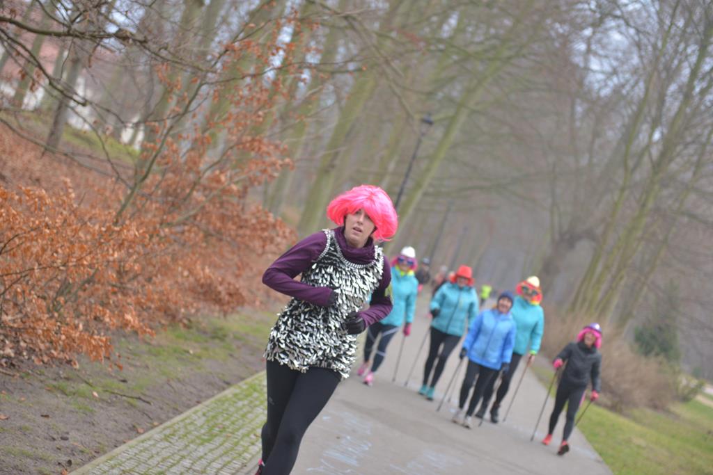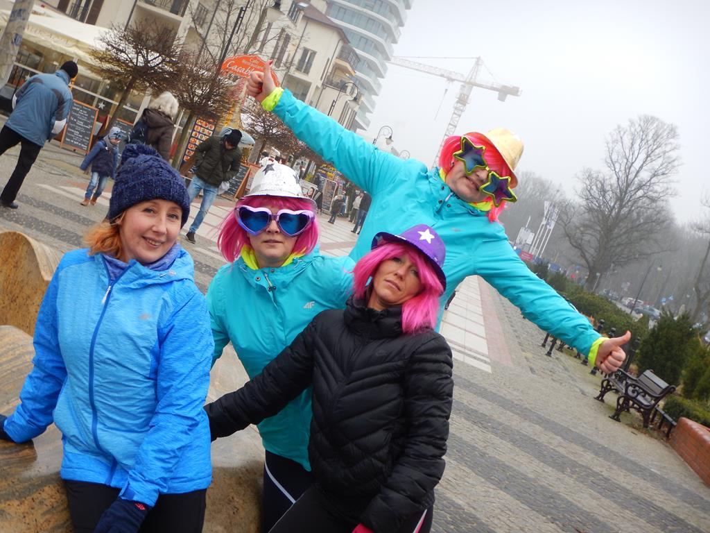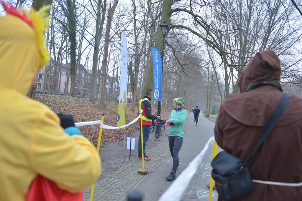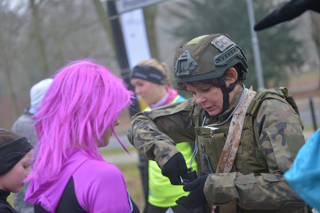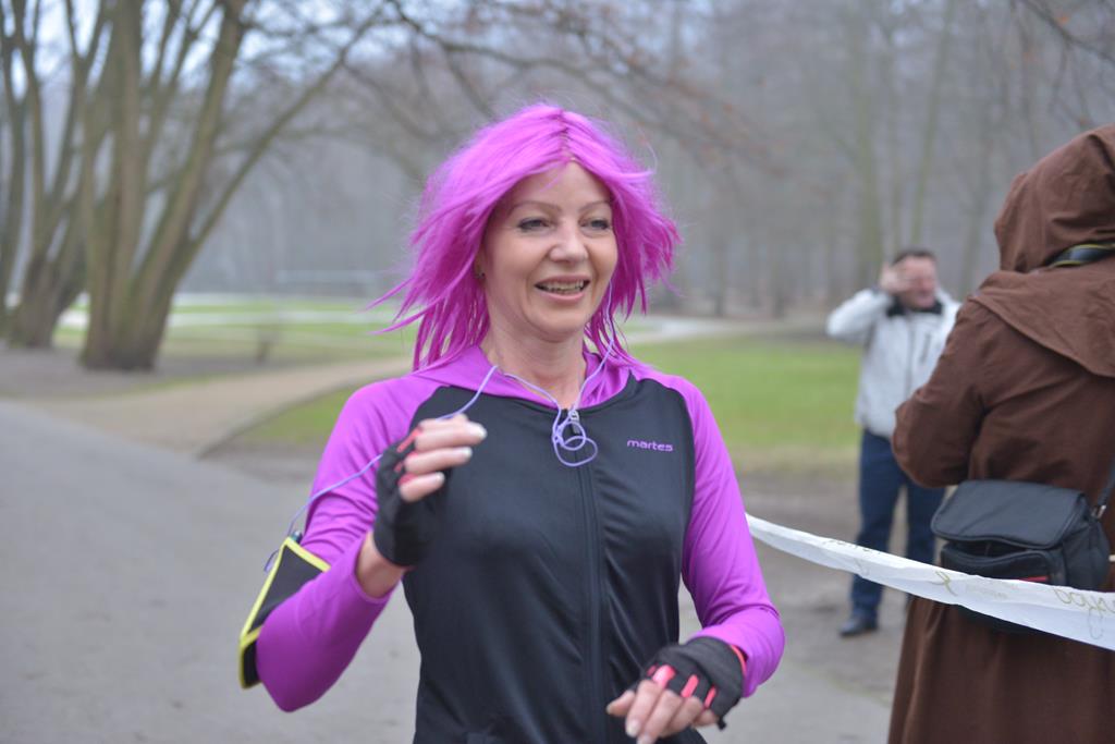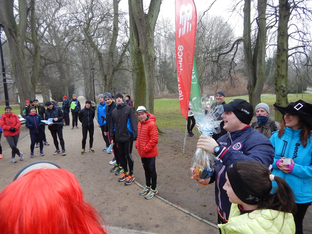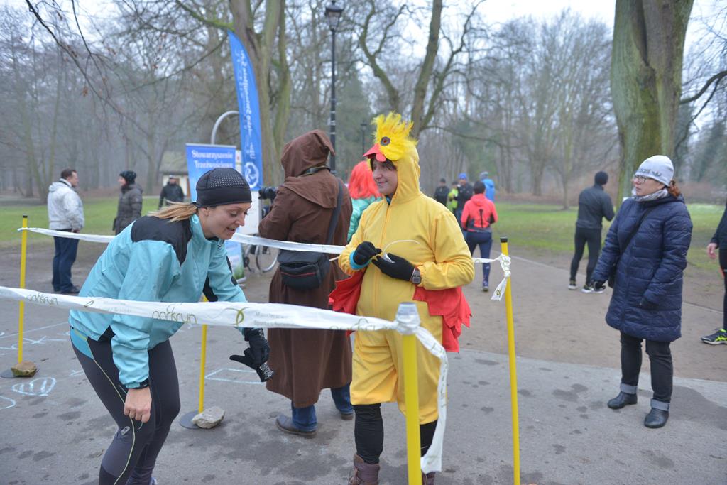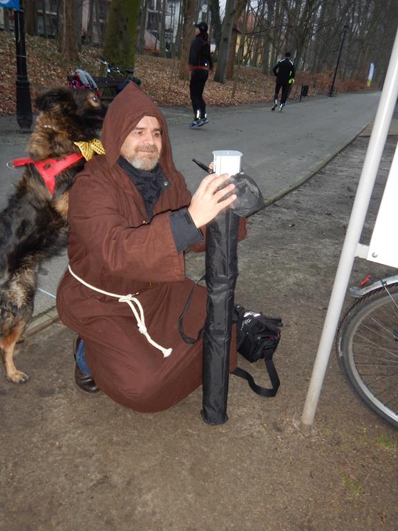 Na starcie stanęło 68 osób i cztery czworonogi i rower bezpieczeństwa, czyli Joanna Bilard. Fotoreporterzy, których było wielu, mieli swoją chwilę, aby uwiecznić ten szczególny moment, ale biegacze byli dzisiaj wyjątkowo rozgadani, rozbawieni i niesforni i jakoś trudno im było stanąć do wspólnego zdjęcia, a było co fotografować. Na bieg zagościł kurczak, groźny niedźwiedź, zakonnica, mnich, kowboj, Smerfetek, radosne i kolorowe morświnki i damy z neonowymi fryzurami. Było na co popatrzeć, gdy cała barwna gromada wystartowała na znak dany przez Wiceprezydenta Miasta Pawła Sujkę. Dodatkową, choć nie zamierzoną, atrakcją już po starcie okazała się wizyta policjantów i żeby nie było”…to nie byli przebierańcy tylko polscy policjanci”.