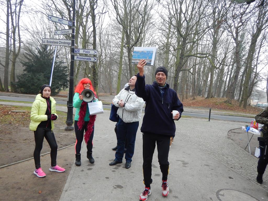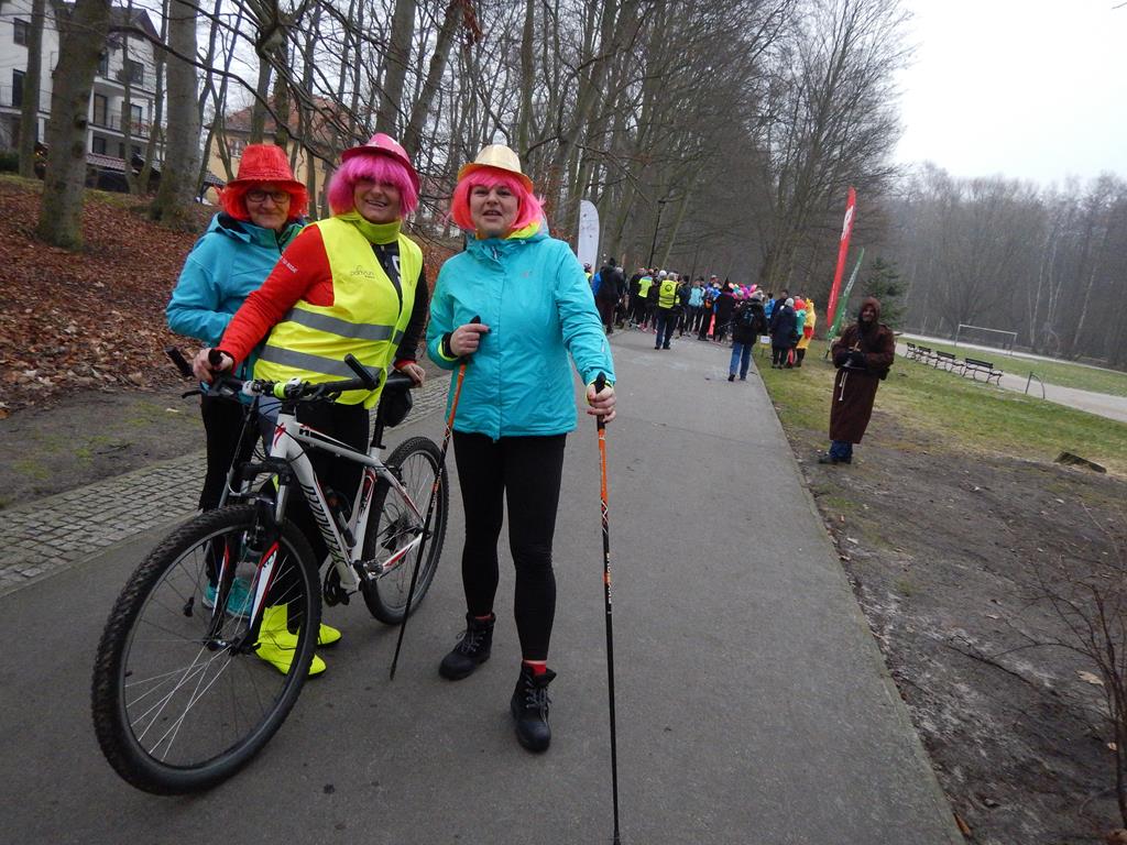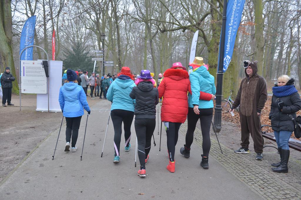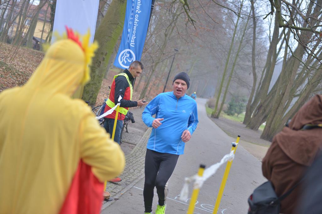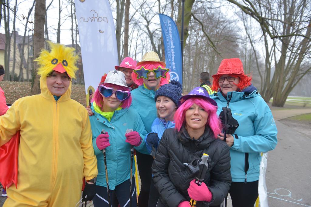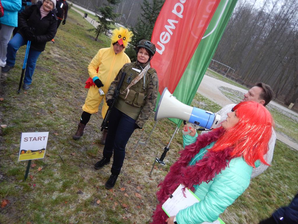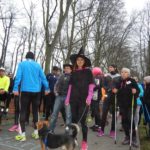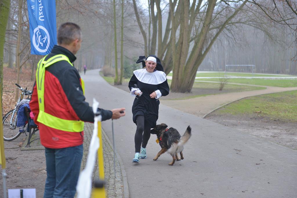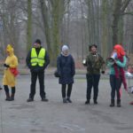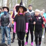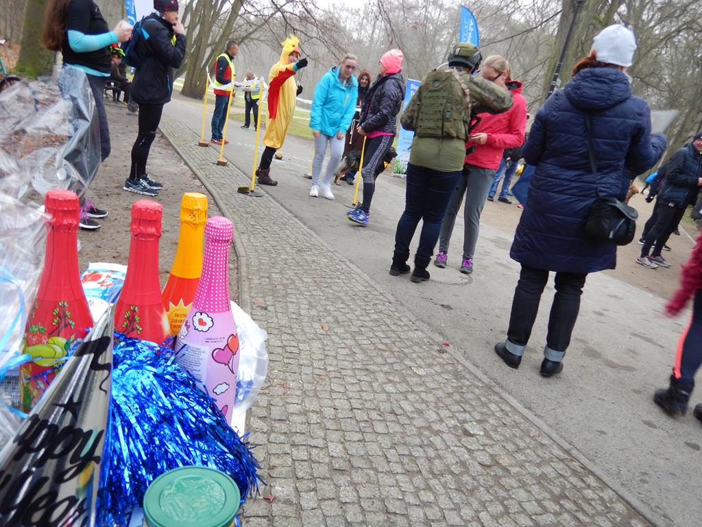 Na starcie stanęło 68 osób i cztery czworonogi i rower bezpieczeństwa, czyli Joanna Bilard. Fotoreporterzy, których było wielu, mieli swoją chwilę, aby uwiecznić ten szczególny moment, ale biegacze byli dzisiaj wyjątkowo rozgadani, rozbawieni i niesforni i jakoś trudno im było stanąć do wspólnego zdjęcia, a było co fotografować. Na bieg zagościł kurczak, groźny niedźwiedź, zakonnica, mnich, kowboj, Smerfetek, radosne i kolorowe morświnki i damy z neonowymi fryzurami. Było na co popatrzeć, gdy cała barwna gromada wystartowała na znak dany przez Wiceprezydenta Miasta Pawła Sujkę. Dodatkową, choć nie zamierzoną, atrakcją już po starcie okazała się wizyta policjantów i żeby nie było”…to nie byli przebierańcy tylko polscy policjanci”.