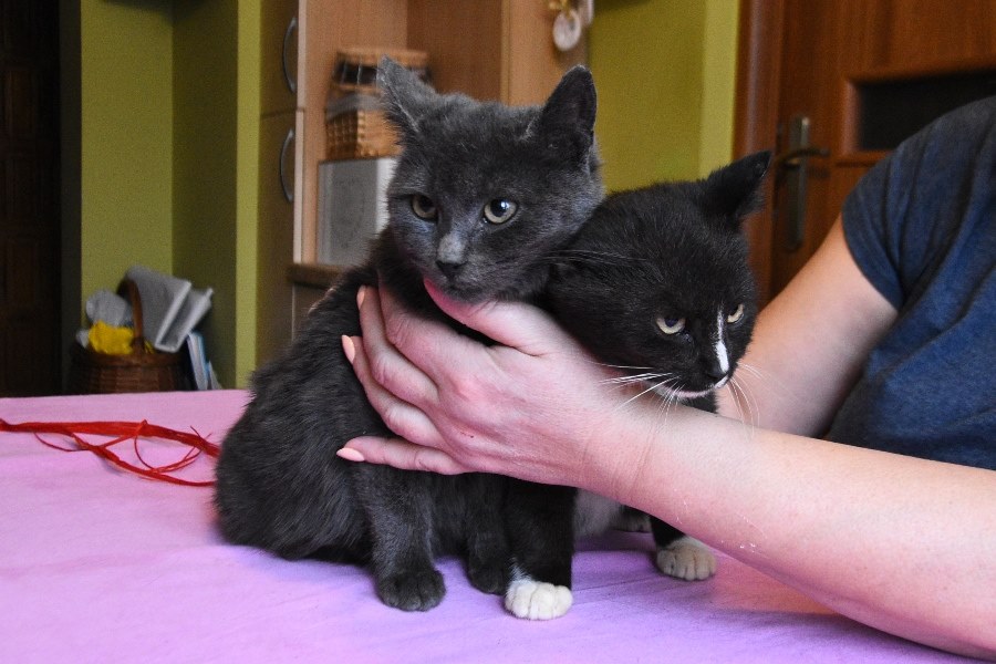 Kotki są już po wizycie u weterynarza. Kotek czarno-białego umaszczenia to kocurek, grafitowej maści jest koteczka. Mają ok. 5 miesięcy. Zostały u weterynarza odpchlone i odrobaczone. Za tydzień zostaną ponownie odrobaczone, trzeba im jeszcze przez tydzień czyścić uszka. Ogólnie są silne i większych problemów nie mają.