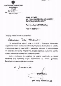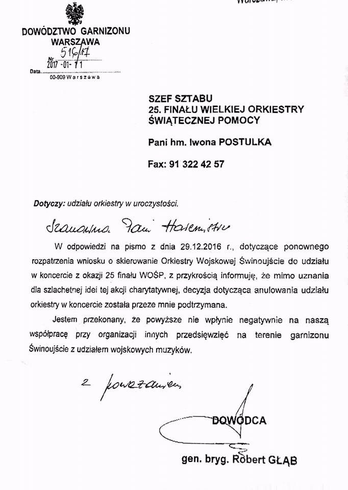 – W odpowiedzi na pismo z dnia 29.12.2016 r., dotyczące ponownego rozpatrzenia wniosku o skierowanie Orkiestry Wojskowej Świnoujście do udziału w koncercie z okazji 25 finału WOŚP, z przykrością informuje, że mimo uznania dla szlachetnej idei tej akcji charytatywnej, decyzja dotycząca anulowania udziału orkiestry w koncercie została przeze mnie podtrzymana. Jestem przekonany, że powyższe nie wpłynie negatywnie na naszą współpracę przy organizacji innych przedsięwzięć na terenie garnizonu Świnoujście z udziałem wojskowych muzyków – napisał dowódca Garnizonu Warszawa gen. bryg. Robert Głąb.