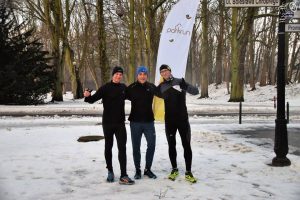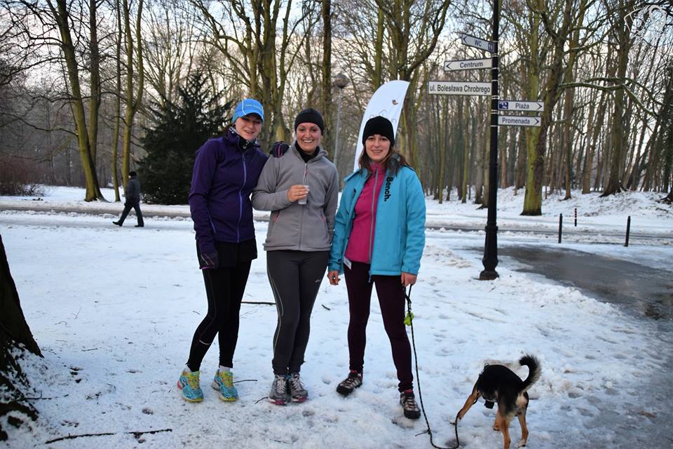 Rozgrzewka, poprowadzona przez Anię Górską była intensywna i bardzo dynamiczna. Na linii startu, ustawili się pełni wigoru i chęci do biegu nasi uczestnicy razem z czterema czworonożnymi ścigaczami. Na sygnał dany przez Elę Jabłońską 38 osób ruszyło na trasę, aby zmierzyć się z zimowymi warunkami i wyzwaniem „życiówka” czy „przeżyciówka” ,  Dla Adama Krawczuka – rower bezpieczeństwa, dzisiejsze zadanie okazało się nie lada wyzwaniem. Następnym razem pewnie założy opony zimowe albo nawet łańcuchy. Najwięcej radości z zimowej aury miały psiaki – Luna, Loyd, Borys i Kiara dla których to była wspaniała zabawa.