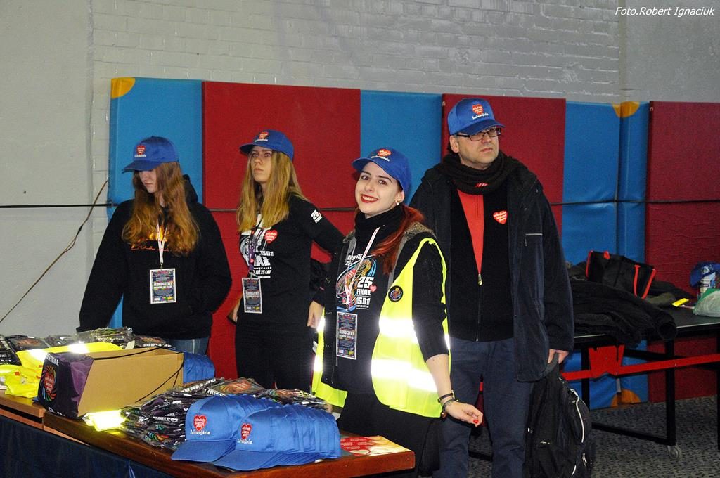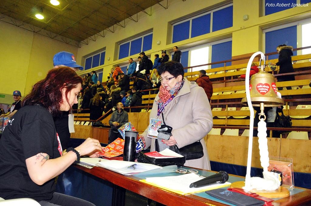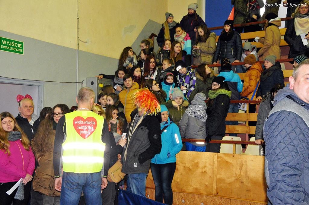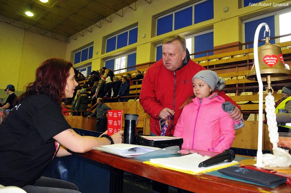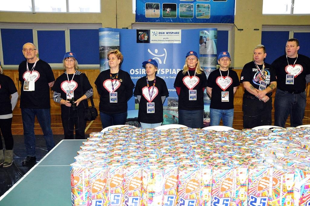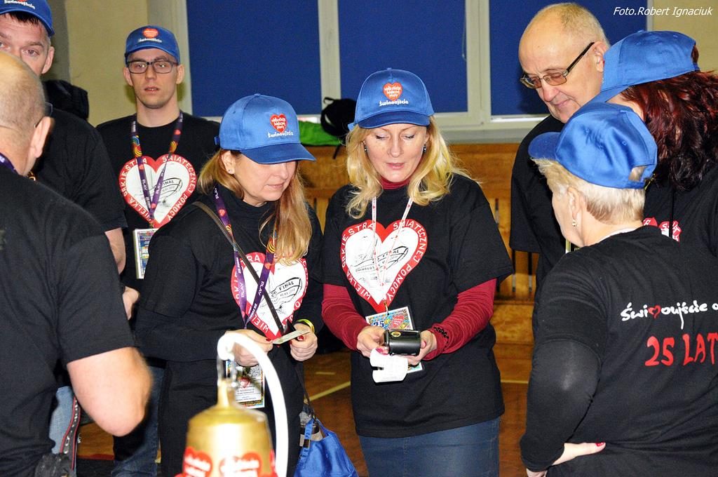 Punktualnie o godz. 9 wolontariusze spotkali się w hali sportowej OSiR przy ul. Piłsudskiego. To w tym miejscu corocznie doprawiani są wolontariusze. Otrzymują identyfikatory, puszki, serduszka oraz przygotowane gadżety. Następnie wyruszają z tekturowymi puszkami w miasto, aby kwestować.