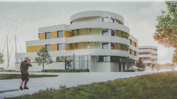 – Mój budynek liczy 4 kondygnacje. Schodkowy układ bryły zwężający się ku górze poprzez stopniowe kondygnacji, zapewnia odpowiedni widok na marinę i tworzy zielone tarasy. Duże balkony umożliwiają wypoczynek na świeżym powietrzu bez konieczności opuszczania apartamentów. Obiekt zaprojektowany jest tak, aby idealnie odpowiadał potrzebom mieszkańców poprzez technologię w nim zawartą i bezpieczeństwo z nią związane. Dodatkowo ukształtowanie formy wychodzi na przeciw potrzebom estetycznym użytkownika otwierając się na walory krajobrazowe z każdej części hotelowej – opowiada młoda architekt Ewa Raczek.