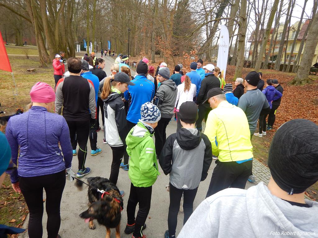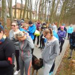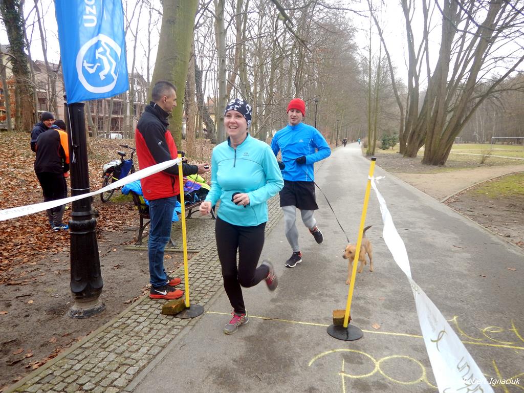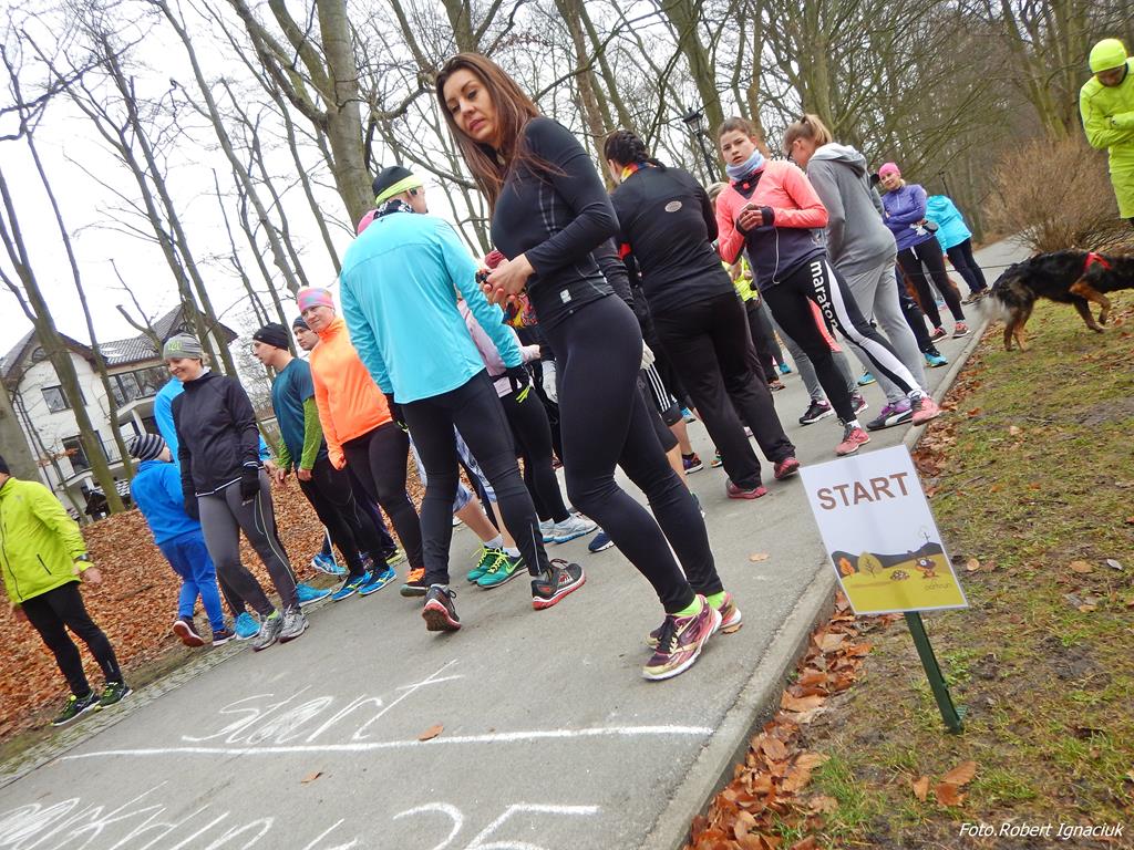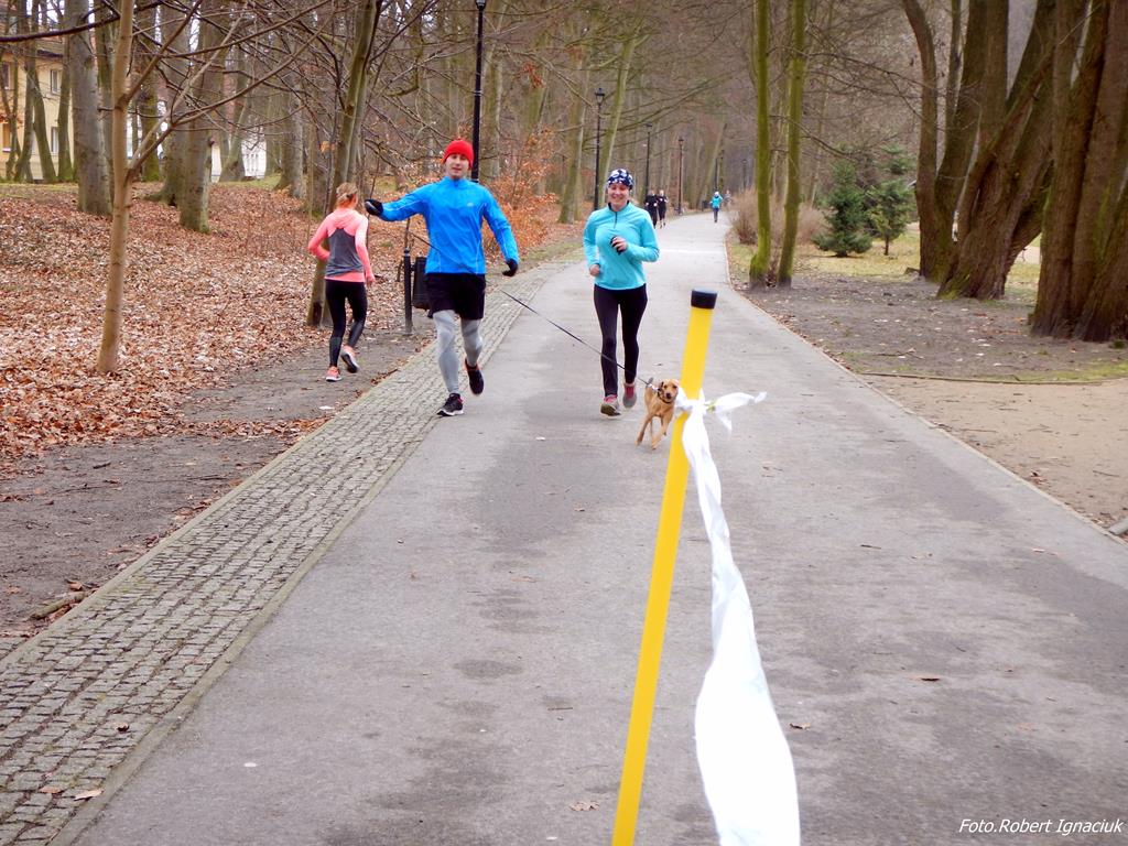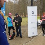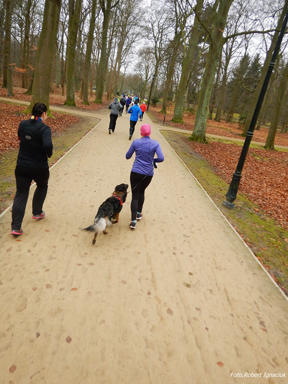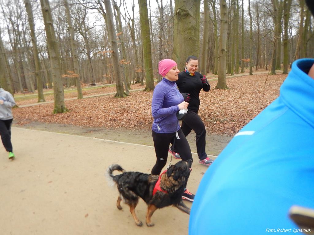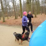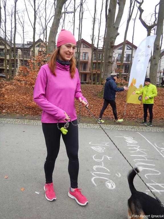 Ewa Mikołajek wraz z Muffinem rozruszała przed biegiem tych bardziej ospałych i tych, którzy lekko zziębnięci przybyli na parkrun. Na starcie stanęło 64 uczestników dwunożnych i 6 czworonożnych.