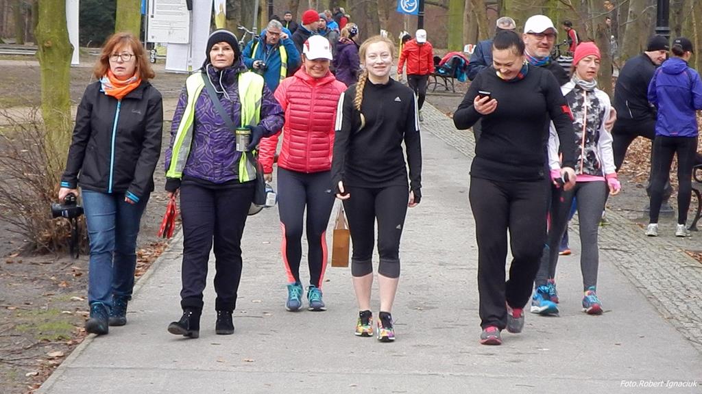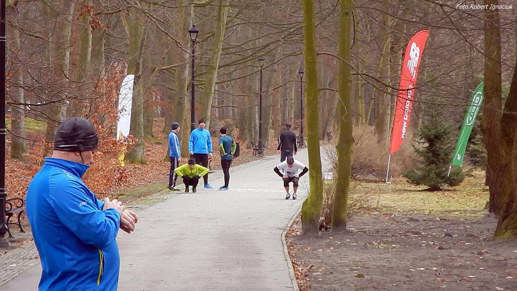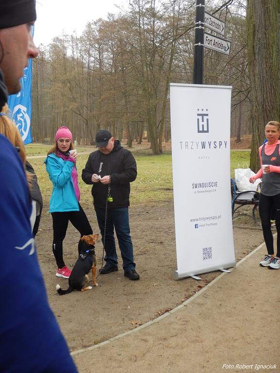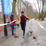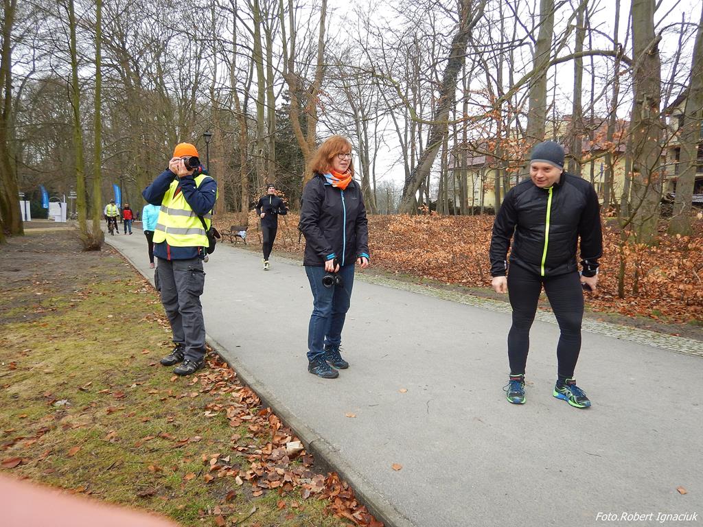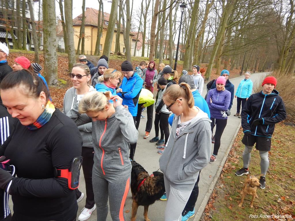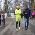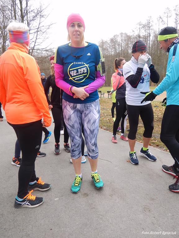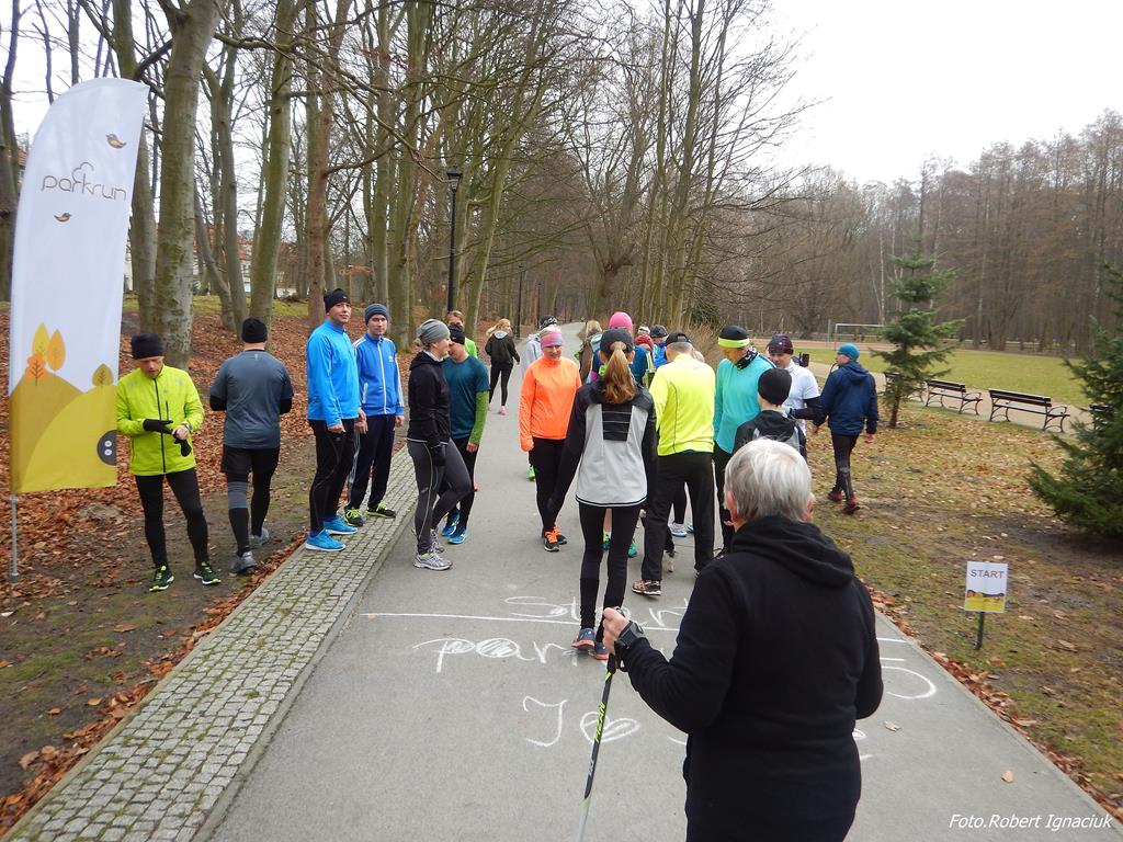 Ewa Mikołajek wraz z Muffinem rozruszała przed biegiem tych bardziej ospałych i tych, którzy lekko zziębnięci przybyli na parkrun. Na starcie stanęło 64 uczestników dwunożnych i 6 czworonożnych.