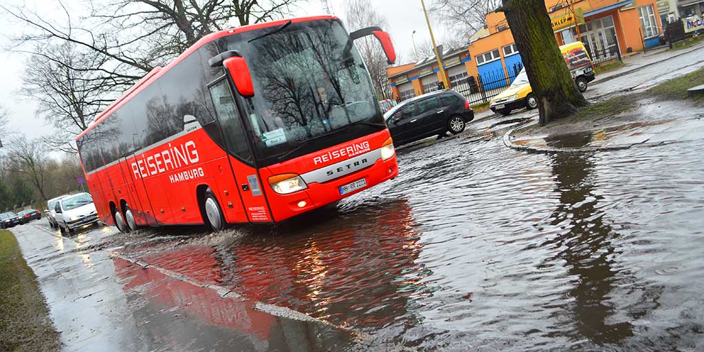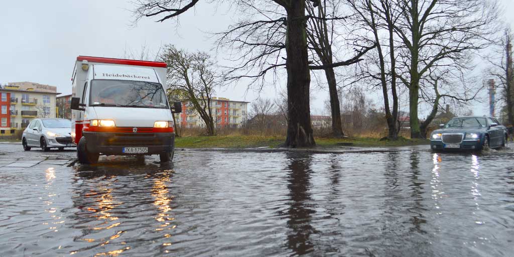 Załamanie pogody w Świnoujściu. Od południa w mieście wieje porywisty wiatr. Synoptycy ostrzegają przed sztormem na morzu. Od rana pada deszcz. W związku z tym woda zalała ulicę Steyera w Świnoujściu. Samochody osobowe mają problem z przejazdem przez skrzyżowaniu z ulicą Łużycką. Część z kierowców wolała nie ryzykować przejazdy przez wodę i pojechała objazdem przez drogę przy garażowisku obok cmentarza.