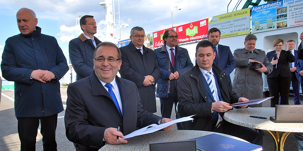 W piątek na promie Karsibór w obecności wicepremiera Mateusza Morawieckiego, prezydent Świnoujścia Janusz Żmurkiewicz podpisał dwie umowy związane z budową tunelu. Pierwsza – o dofinansowaniu połączenia komunikacyjnego pomiędzy wyspami Uznam i Wolin w Świnoujściu, a drugą o pełnieniu funkcji inwestora zastępczego przez GDDKIA.