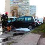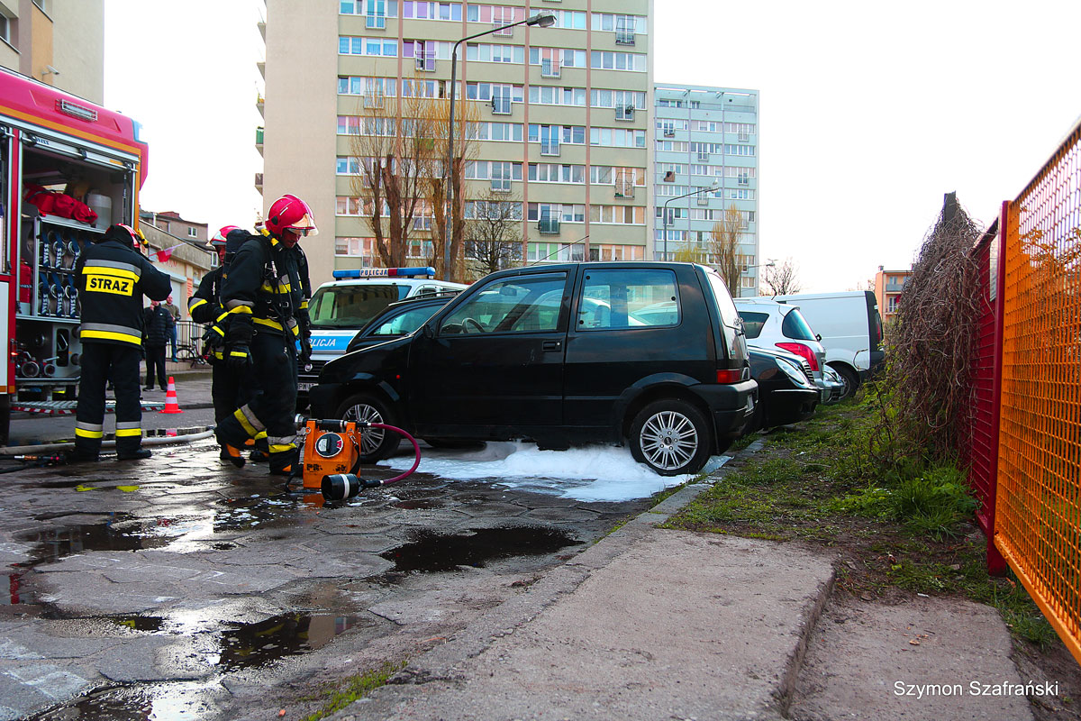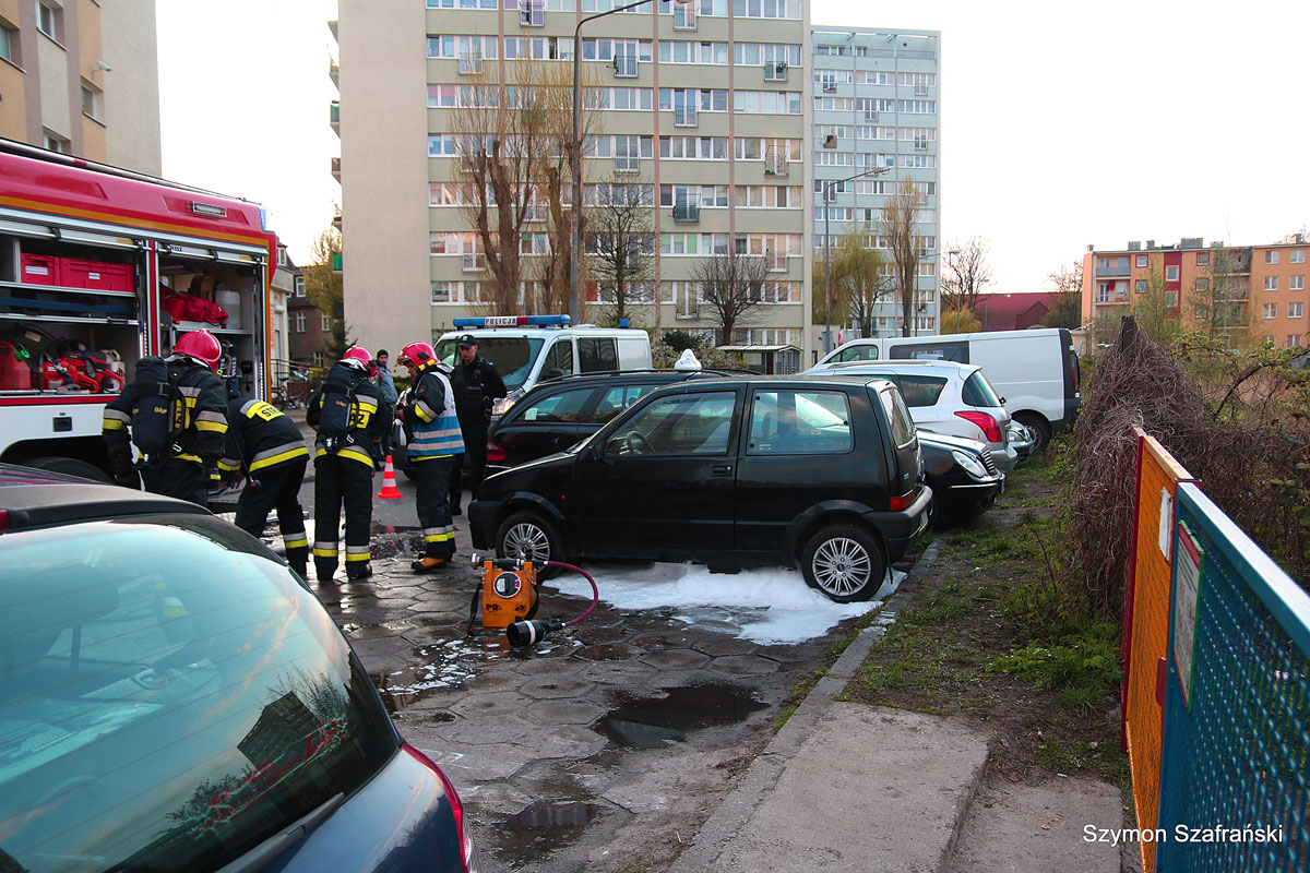 Strażacy zneutralizowali wyciek paliwa z samochodu cinquecento. Istniało zagrożenie zapłonu i przeniesienie ognia na samochody zaparkowane na parkingu. Na miejsce wezwano dwa zastępy oraz policję.