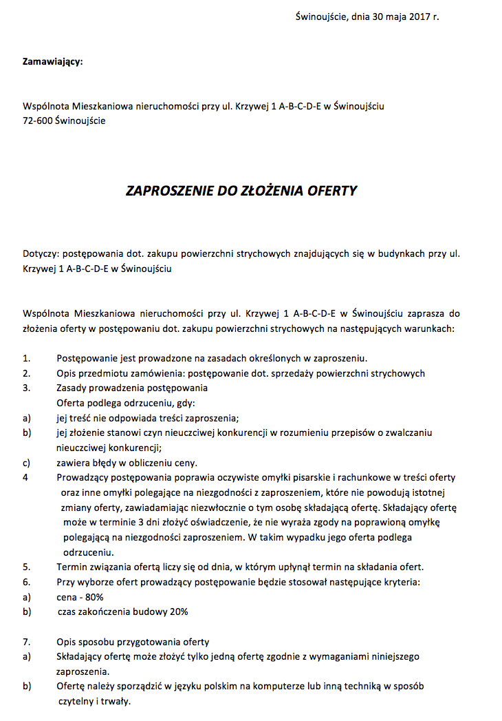 Wspólnota Mieszkaniowa nieruchomości przy ul. Krzywej 1 A-B-C-D-E w Świnoujściu zaprasza do złożenia oferty w postępowaniu dot. zakupu powierzchni strychowych.