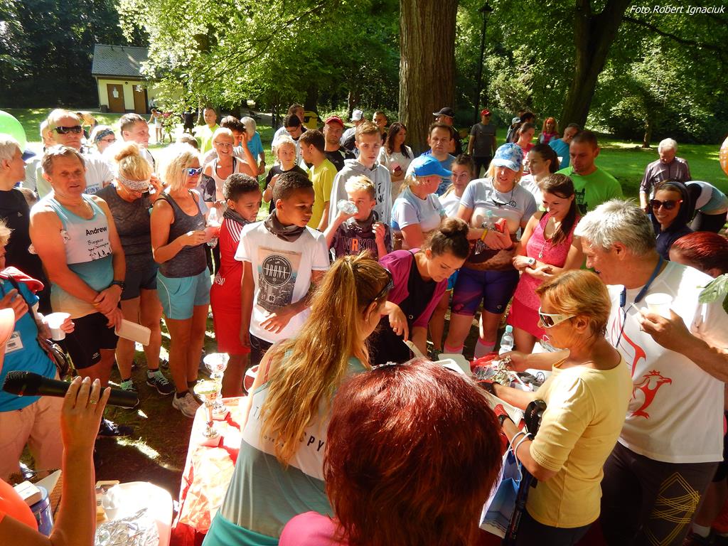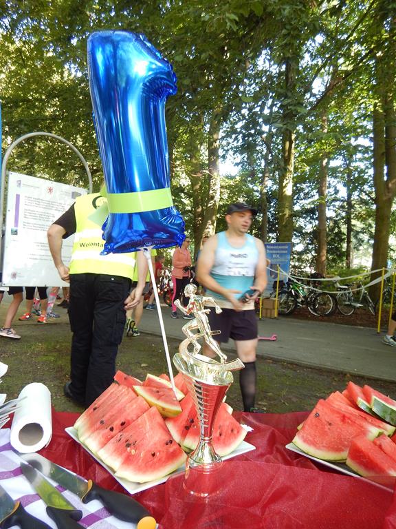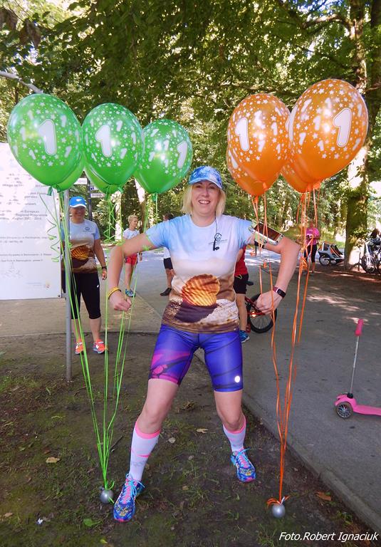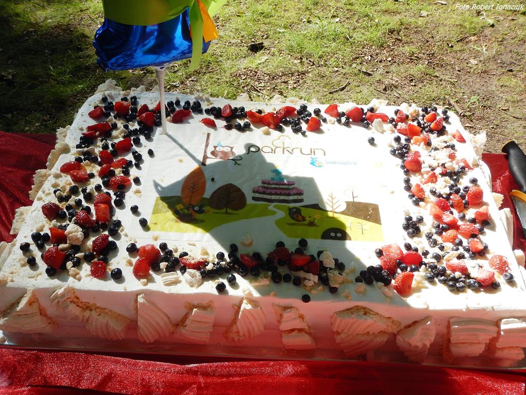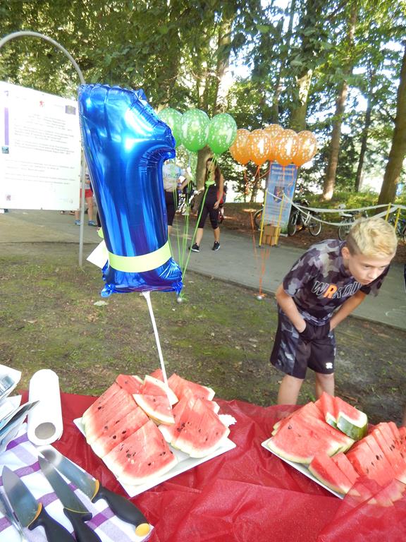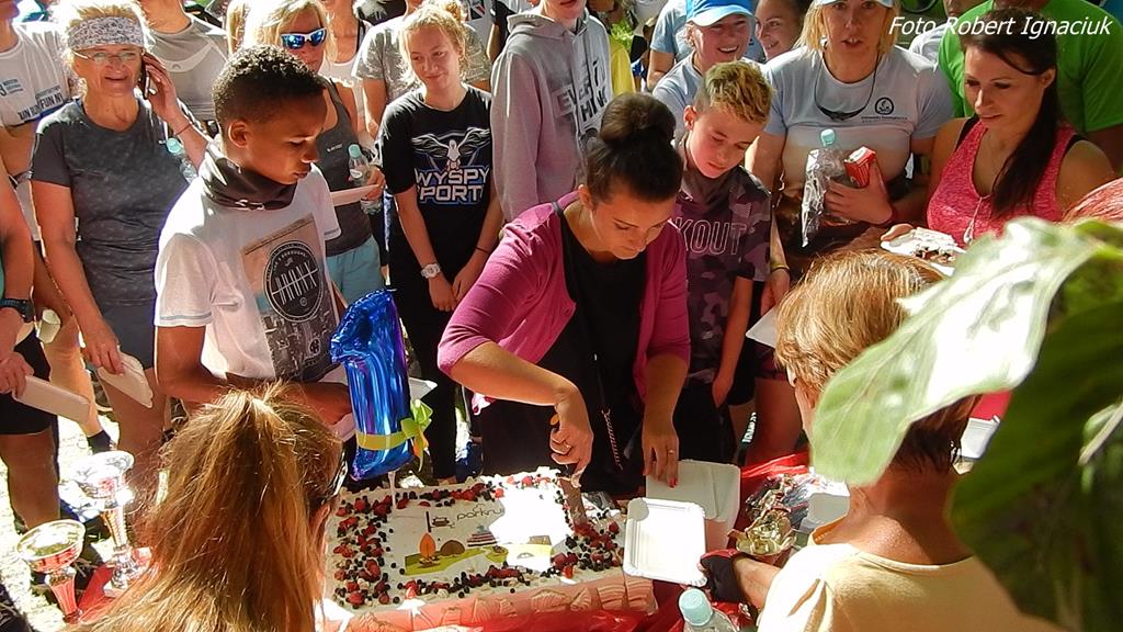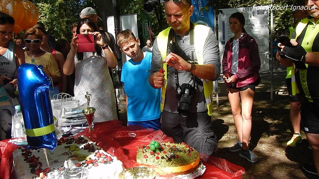 Część rekreacyjna parkrunu miała charakter piknikowy. Na trawie na przyniesionych przez Mariusza Małochę kocykach, wśród kolorowych plażowych piłek i parasoli, tym razem chroniącym przed słońcem, można się było zrelaksować i oddać łakomstwu. Po biegu wszyscy częstowali się naszym wspaniałym urodzinowym tortem (ukłony i podziękowania dla piekarni Jarosława Węglarza), smacznym ciastem (ukłony i podziękowania dla Anety Burnat-Szczęsnej i Jagody Jaruszewskiej) i arbuzem, nadmienię tu, że wszystko zostało skonsumowane do ostatniego okruszka. Do tego serwowano wodę mineralną, pyszną kawę i dla łasuchów cukierki i czekoladę.
