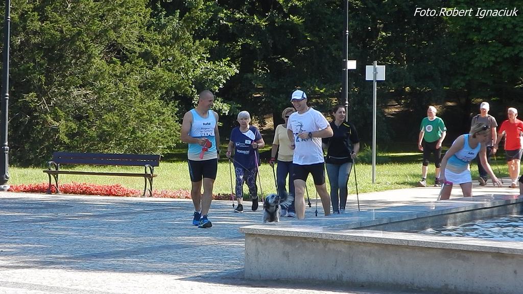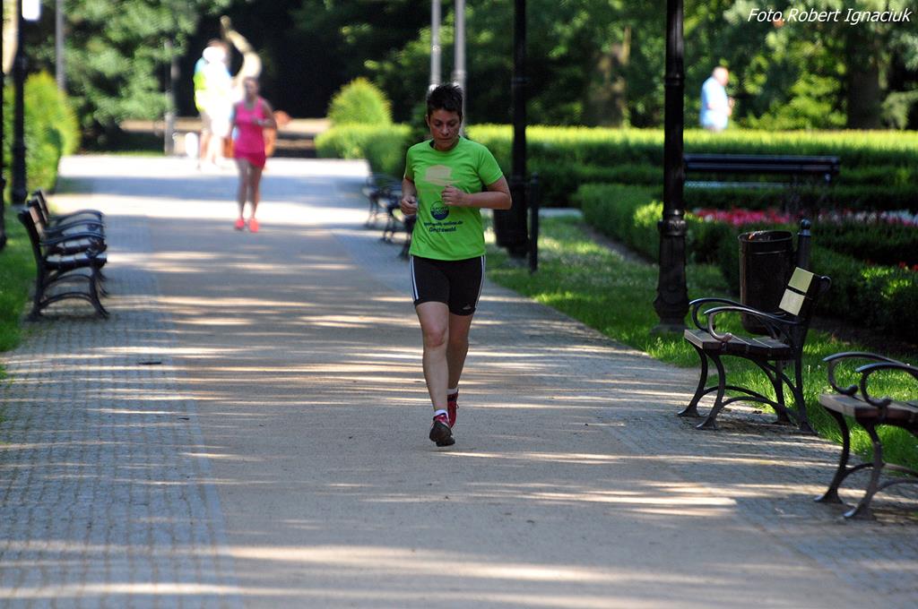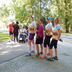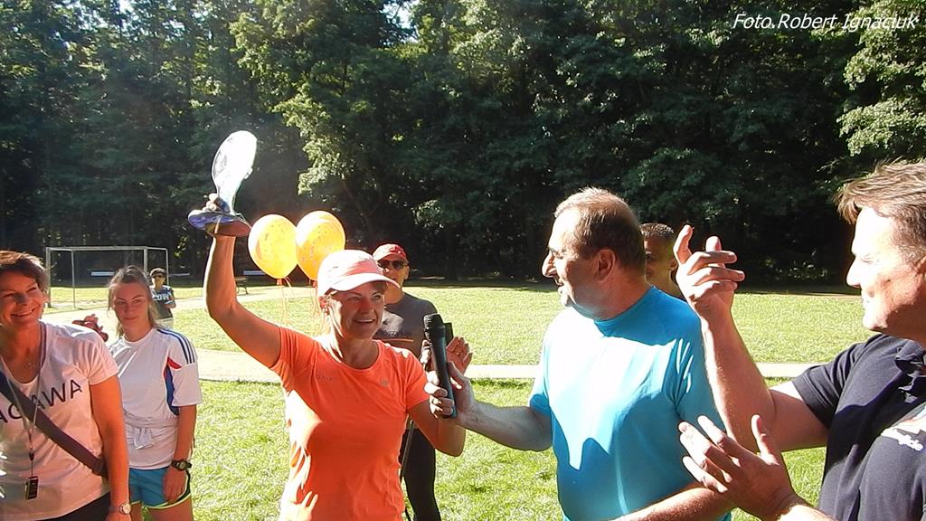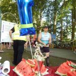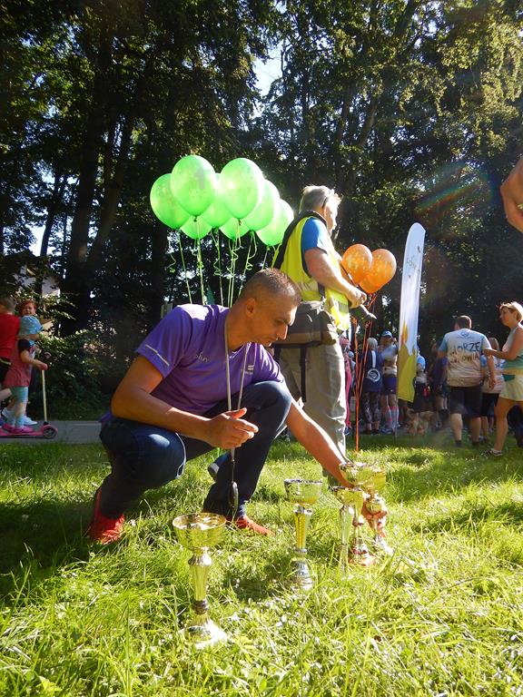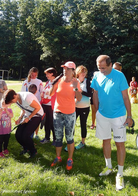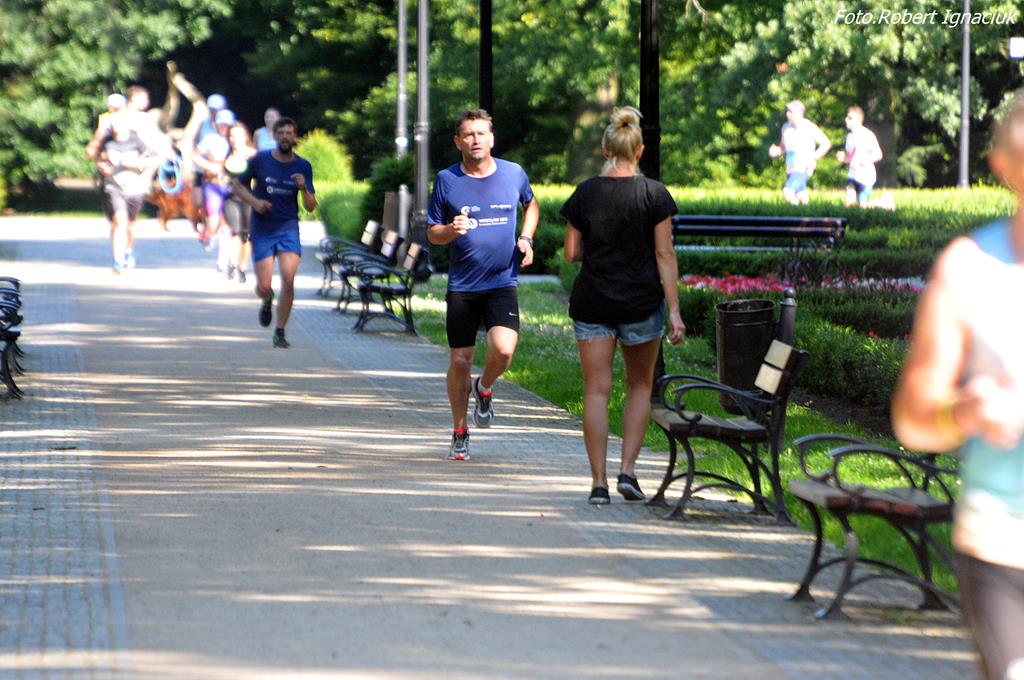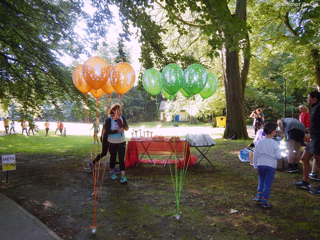 Część rekreacyjna parkrunu miała charakter piknikowy. Na trawie na przyniesionych przez Mariusza Małochę kocykach, wśród kolorowych plażowych piłek i parasoli, tym razem chroniącym przed słońcem, można się było zrelaksować i oddać łakomstwu. Po biegu wszyscy częstowali się naszym wspaniałym urodzinowym tortem (ukłony i podziękowania dla piekarni Jarosława Węglarza), smacznym ciastem (ukłony i podziękowania dla Anety Burnat-Szczęsnej i Jagody Jaruszewskiej) i arbuzem, nadmienię tu, że wszystko zostało skonsumowane do ostatniego okruszka. Do tego serwowano wodę mineralną, pyszną kawę i dla łasuchów cukierki i czekoladę.