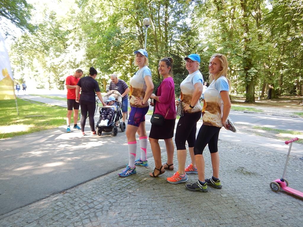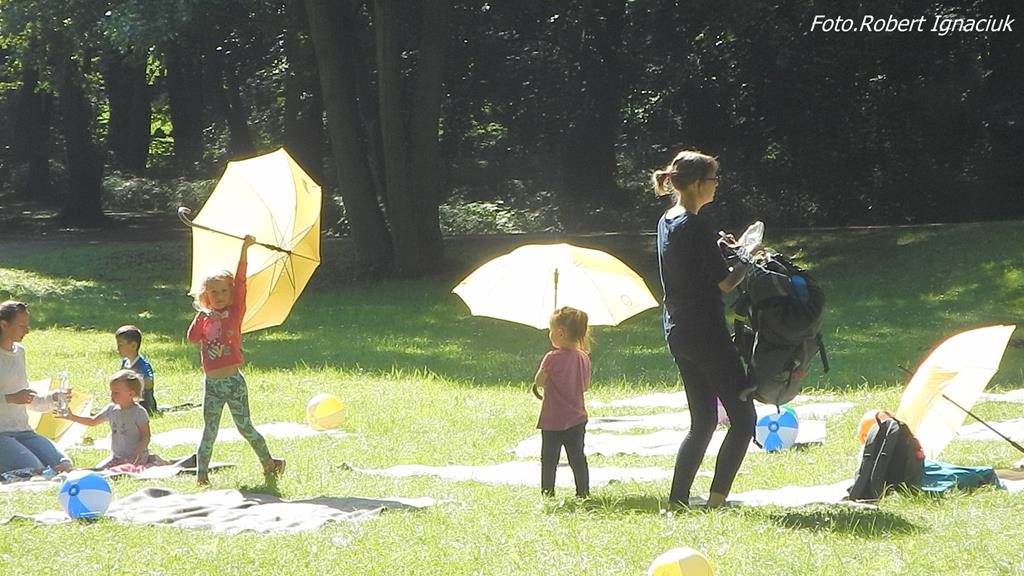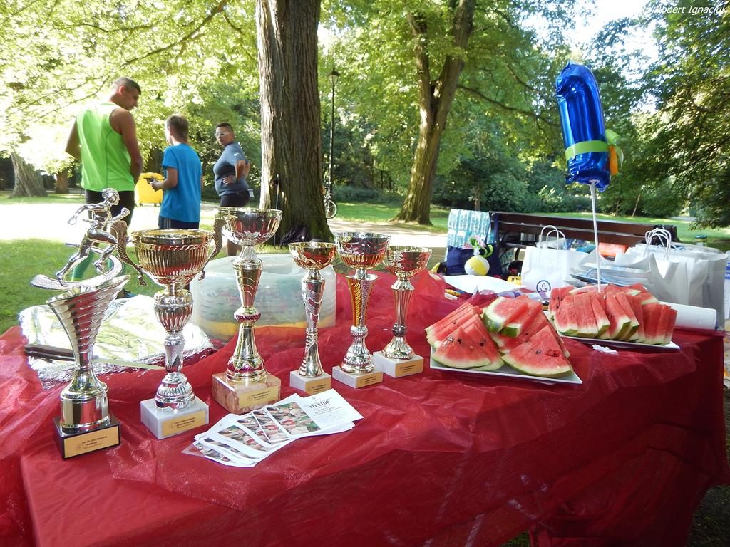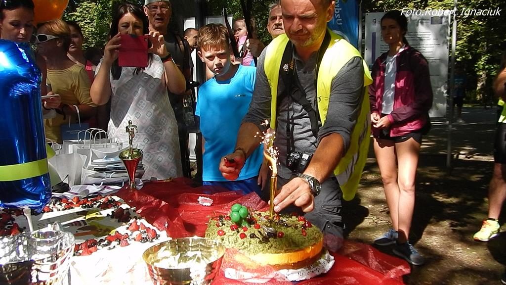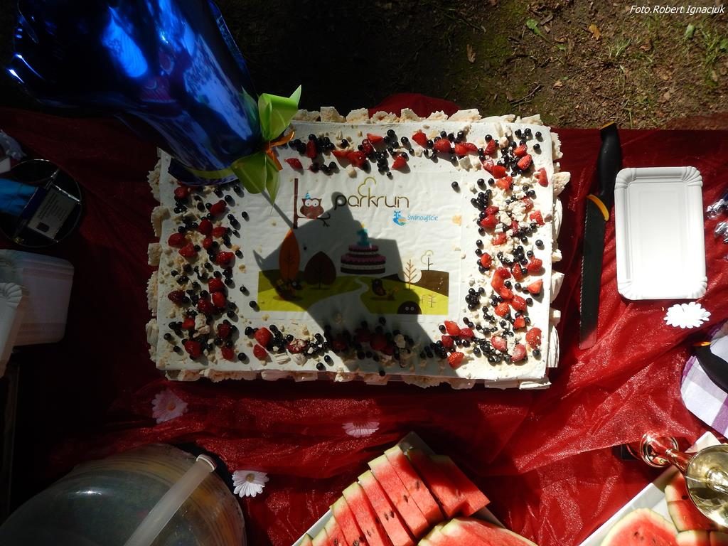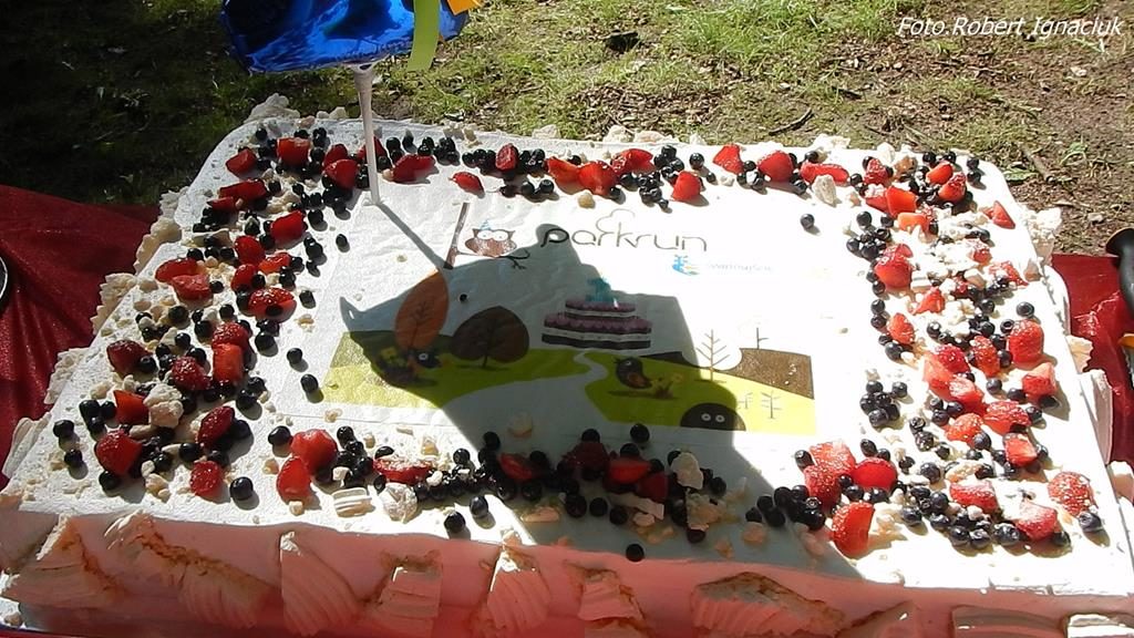 Część rekreacyjna parkrunu miała charakter piknikowy. Na trawie na przyniesionych przez Mariusza Małochę kocykach, wśród kolorowych plażowych piłek i parasoli, tym razem chroniącym przed słońcem, można się było zrelaksować i oddać łakomstwu. Po biegu wszyscy częstowali się naszym wspaniałym urodzinowym tortem (ukłony i podziękowania dla piekarni Jarosława Węglarza), smacznym ciastem (ukłony i podziękowania dla Anety Burnat-Szczęsnej i Jagody Jaruszewskiej) i arbuzem, nadmienię tu, że wszystko zostało skonsumowane do ostatniego okruszka. Do tego serwowano wodę mineralną, pyszną kawę i dla łasuchów cukierki i czekoladę.