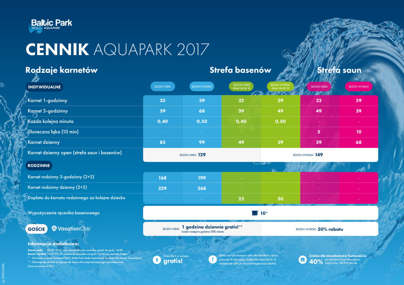 Opublikowano cennik biletów wstępu do aquaparku i saun w Baltic Park w Świnoujściu. Koszt biletów podzielono na sezon niski oraz wysoki, czyli od lipca do września. Na zniżki mogą liczyć rodziny, dzieci do lat 16, a także mieszkańcy miasta. Za darmo wchodzą dzieci do 1 metra wysokości. Porównaliśmy ceny hotelowego aquaparku z Ostsee Therme w Ahlbecku.