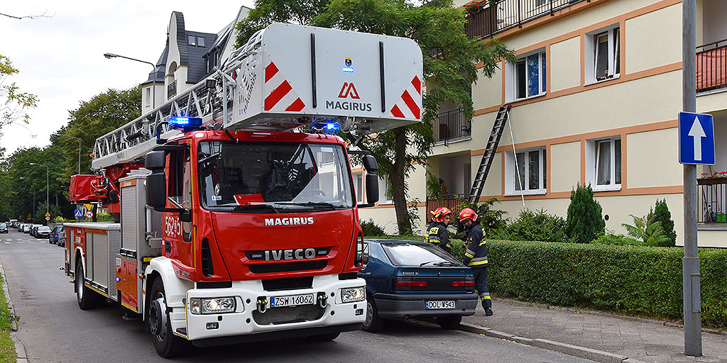 Dziecko zatrzaśnięte w mieszkaniu. Strażacy weszli po drabinie
