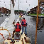Tegoroczne obozy żeglarskie dla dzieci i młodzieży organizowane były pod hasłem żeglowania Śladami Osadników. Pod tym hasłem kryło się odwiedzenie miejsc, które  przed wiekami zasiedlali nasi słowiańscy przodkowie, a następnie po II wojnie światowej polscy osadnicy. Ta rozpiętość historyczna zdecydowała o włączeniu do programu wizyty w niektórych niemieckich portach jachtowych. Odpowiednio do tego ukształtowany został program edukacyjny i wychowawczy obozów. I tak w związku z planowanym pobytem w przygranicznym niemieckim porcie Kamminke w programie uwzględniono pogadankę o dziejach Świnoujścia w ostatnich miesiącach II wojny światowej oraz wycieczkę na największy w Niemczech wojenny cmentarz na wzgórzu Golm. Uczestnicy po zwiedzeniu dokonali wpisu do książki pamiątkowej cmentarza. Podobnie pobyt w portach Ueckermünde, Nowe Warpno i Trzebież połączono z pogadankami na temat polskiego osadnictwa po II wojnie oraz kształtowaniu się naszej zachodniej granicy. Postoje w portach Stepnica oraz Wapnica – Lubin stały się sposobnością dla omówienia tradycji polskiego osadnictwa najbliższej nam okolicy w różnych okresach historycznych. Jednakże nie tylko historia dominowała w realizowanym programie obozu. Zwiedzanie małych, ale bardzo pięknych portów i miejscowości Trzebież, Nowe Warpno, Stepnica, Wapnica pozwoliły ukazać urodę tych miejscowości i ich walory turystyczne. Jak każdego roku atrakcją była wycieczka do fabryki wyrobów czekoladowych Dobosza w Trzebieży, gdzie młodzież mogła zakupić łakocie po atrakcyjnej „fabrycznej” cenie.