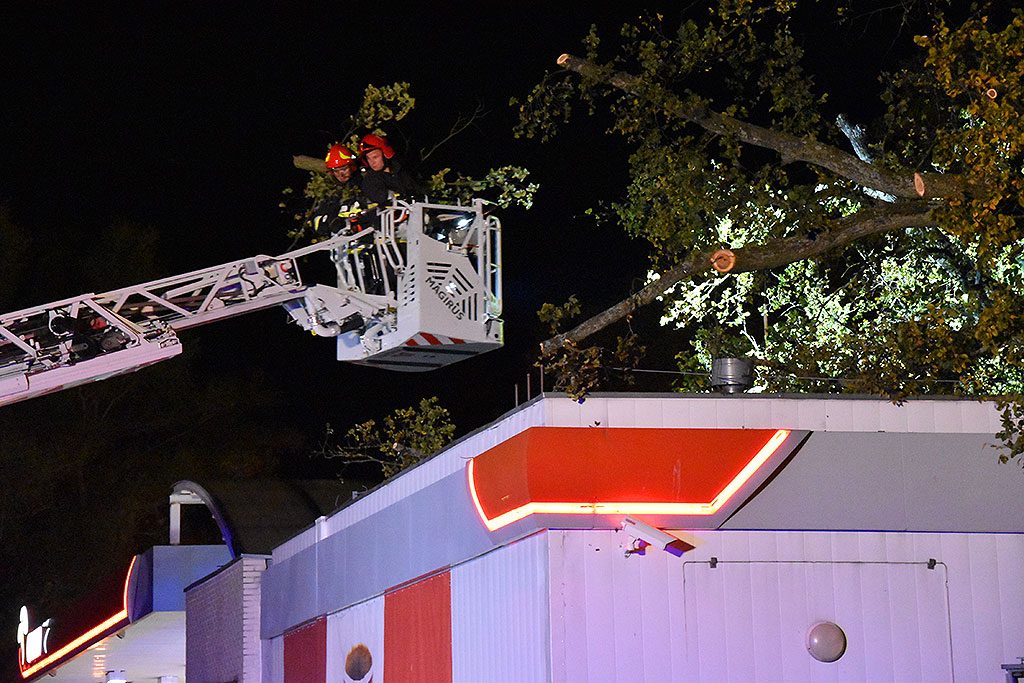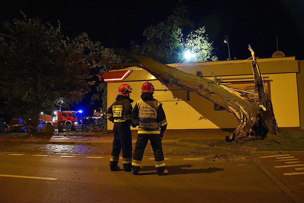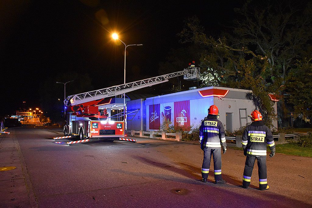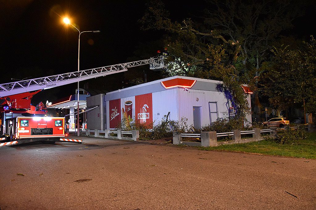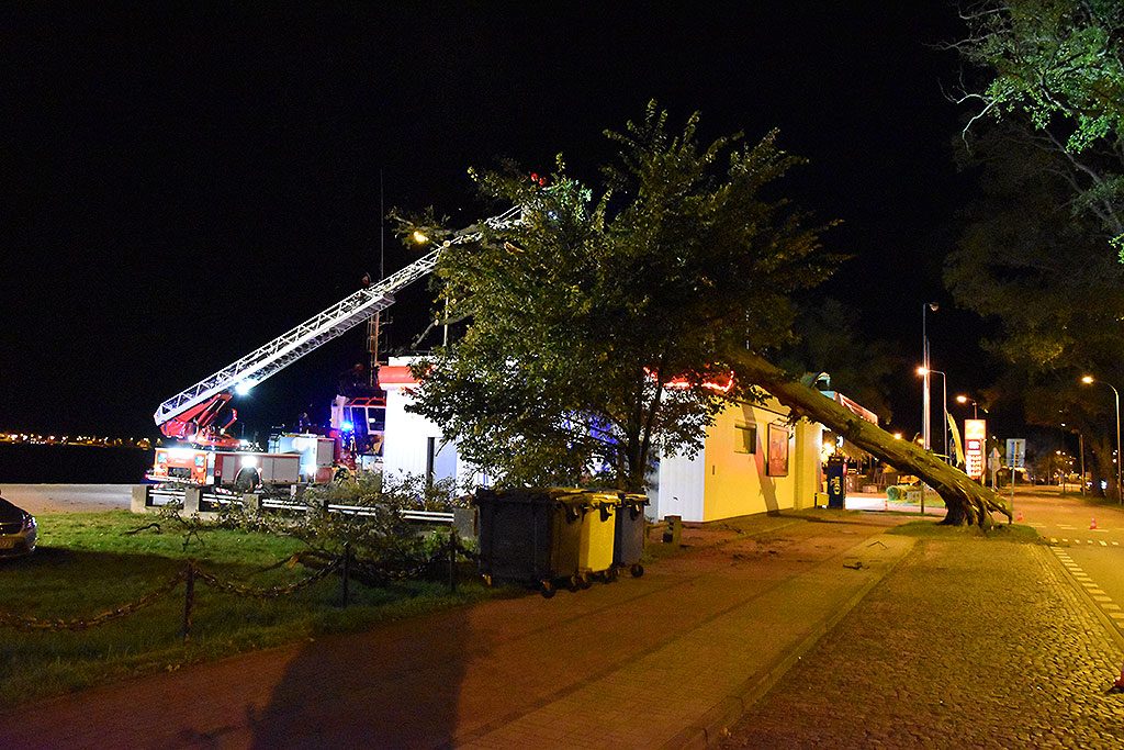 Porywisty wiatr złamał drzewo rosnące przy stacji paliw Orlen przy ul. Wybrzeże Władysława IV w Świnoujściu. Konar przewrócił się na ścianę niedawno wyremontowanego budynku. Na szczęście nikomu nic się nie stało.
