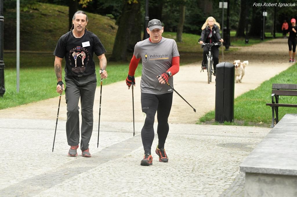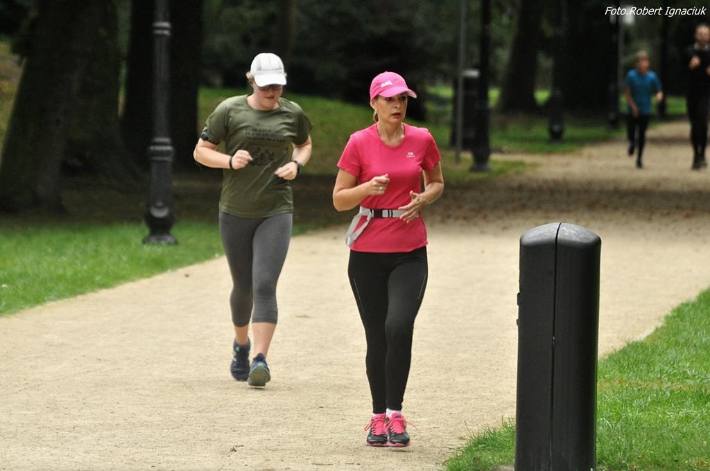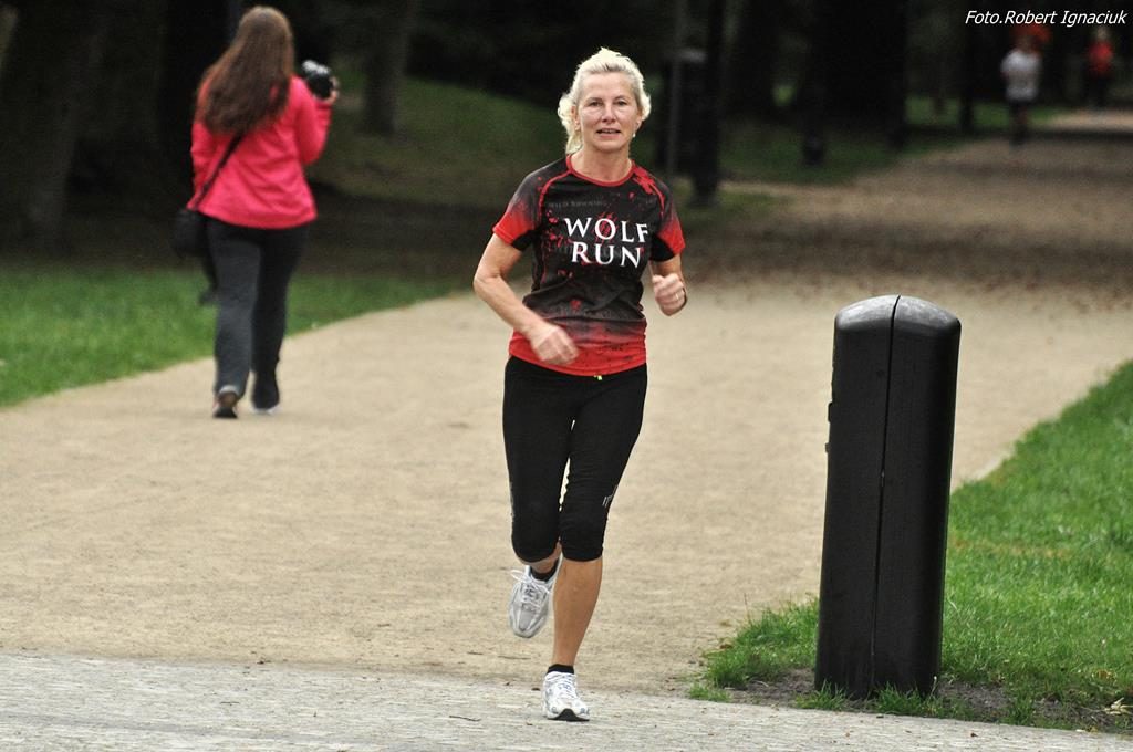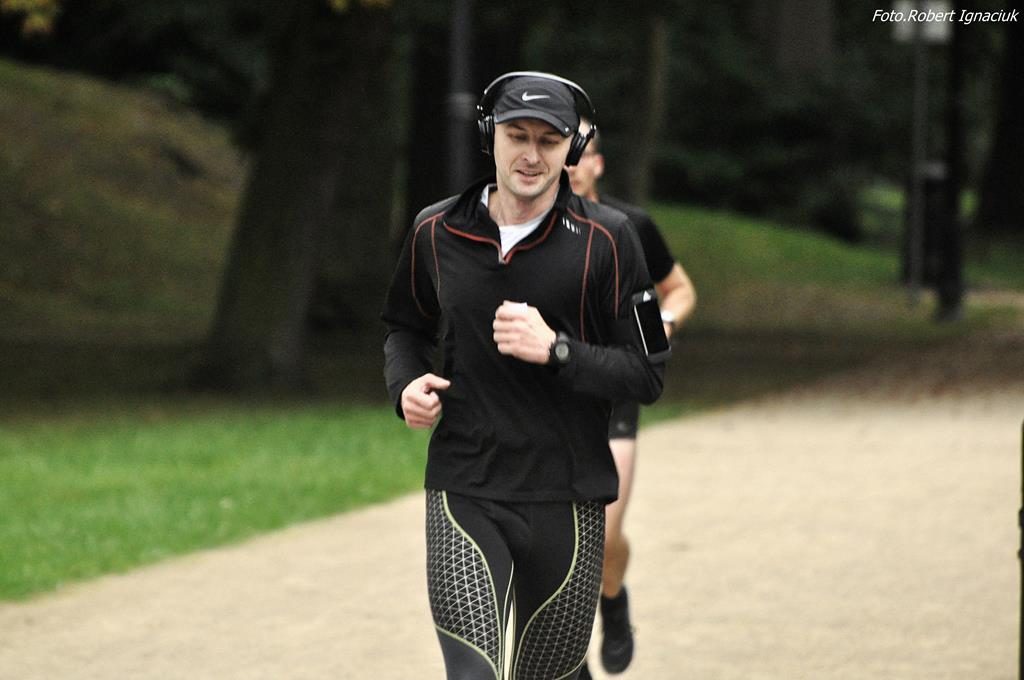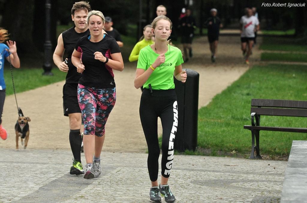 77 osób, w tym 7 debiutantów, tupało dzisiaj na starcie, bynajmniej nie z zimna a z niecierpliwości aby puścić się biegiem po parku. I wyruszyli rozgrzani przez Karolinę, poinstruowani przez Elę i zaasekurowani przez Adama z przodu i Anetę z tyłu. Ani się obejrzeliśmy a już na mecie meldowali się pierwsi biegacze. Najkrócej na trasie przebywali: