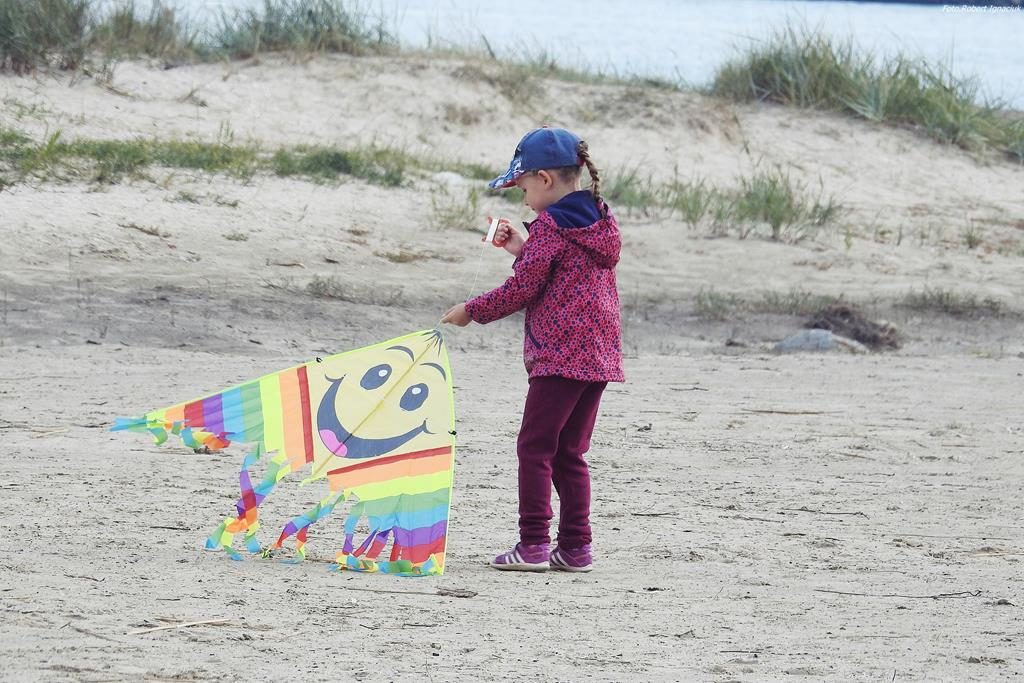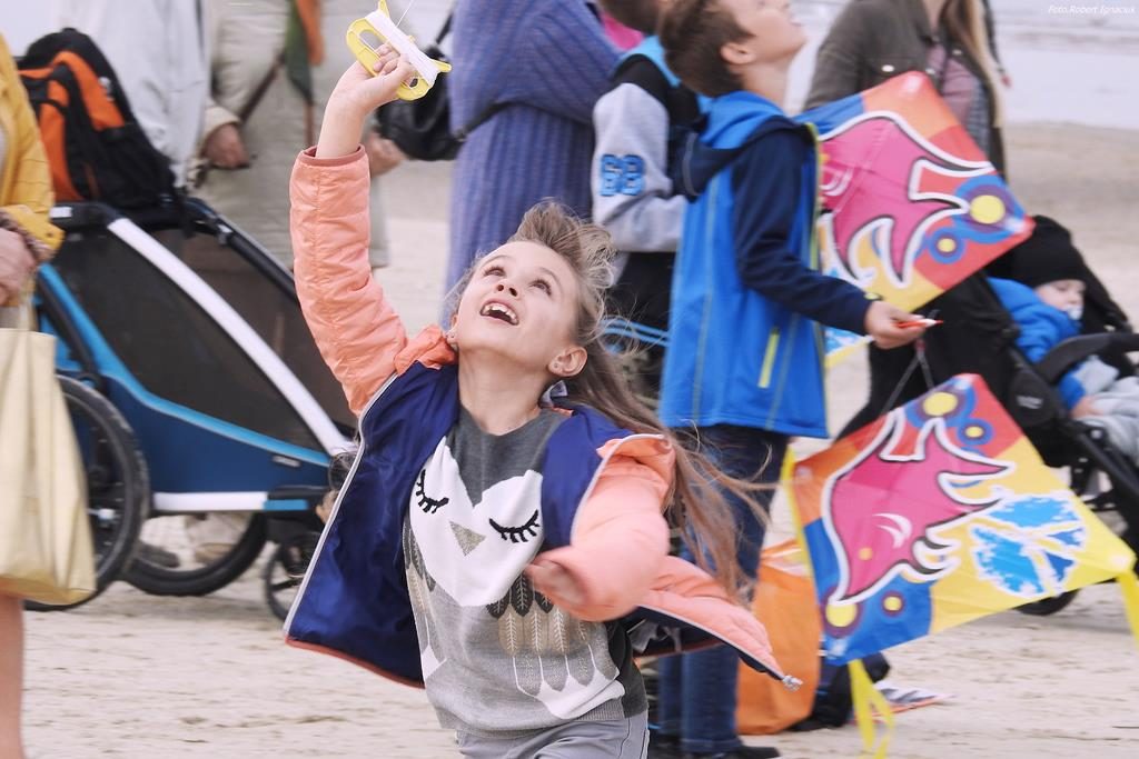 Mnóstwo kolorowych latawców, jedne własnoręcznie robione, inne kupione, z długimi ogonami i te w kształcie ptaków.