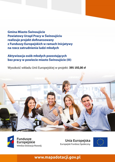 Gmina Miasto i Świnoujście Powiatowy Urząd Pracy w Świnoujście realizuje projekt dofinansowany z Funduszy Europejskich w ramach inicjatywy na rzecz zatrudnienia ludzi młodych pn. Aktywizacja osób młodych pozostających bez pracy w powiecie miasto Świnoujście (III). Wysokość wkładu Unii Europejskiej w projekt: 395 192,00 zł.
