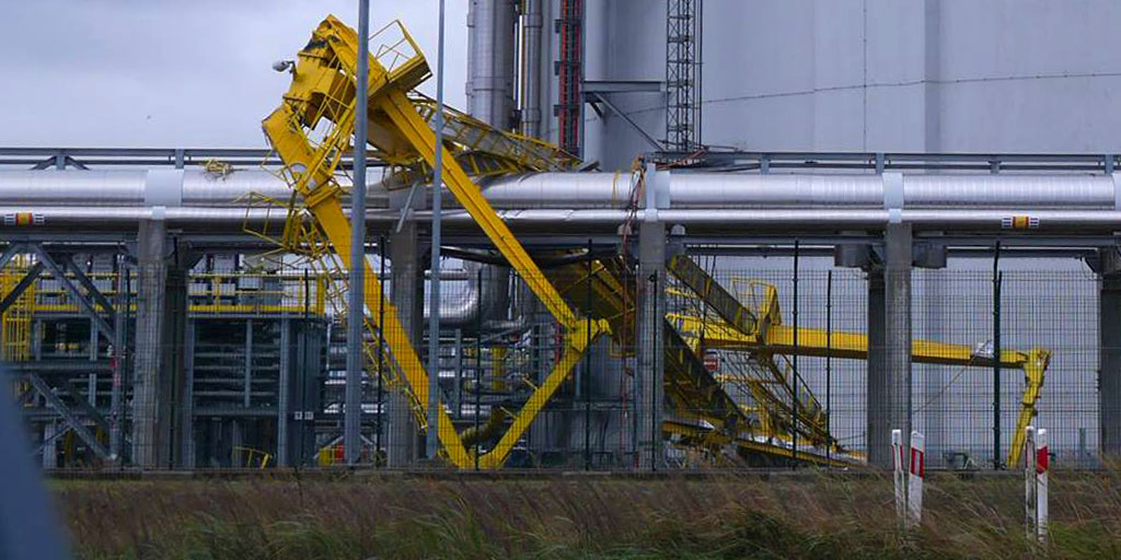 Porywisty wiatr oderwał metalową suwnicę przymocowaną na kopule gazoportu. Stalowy element odrywając się, uszkodził rurociąg, doprowadzając do rozszczelnienia. W wyniku awarii, zaczął ulatniać się gaz. Foto: Wojciech Basałygo
