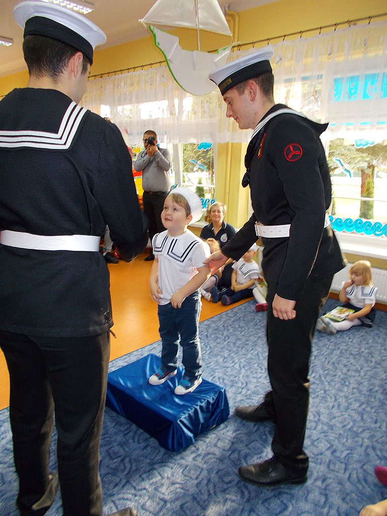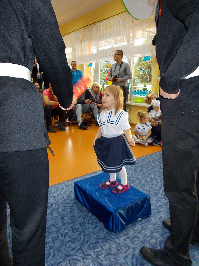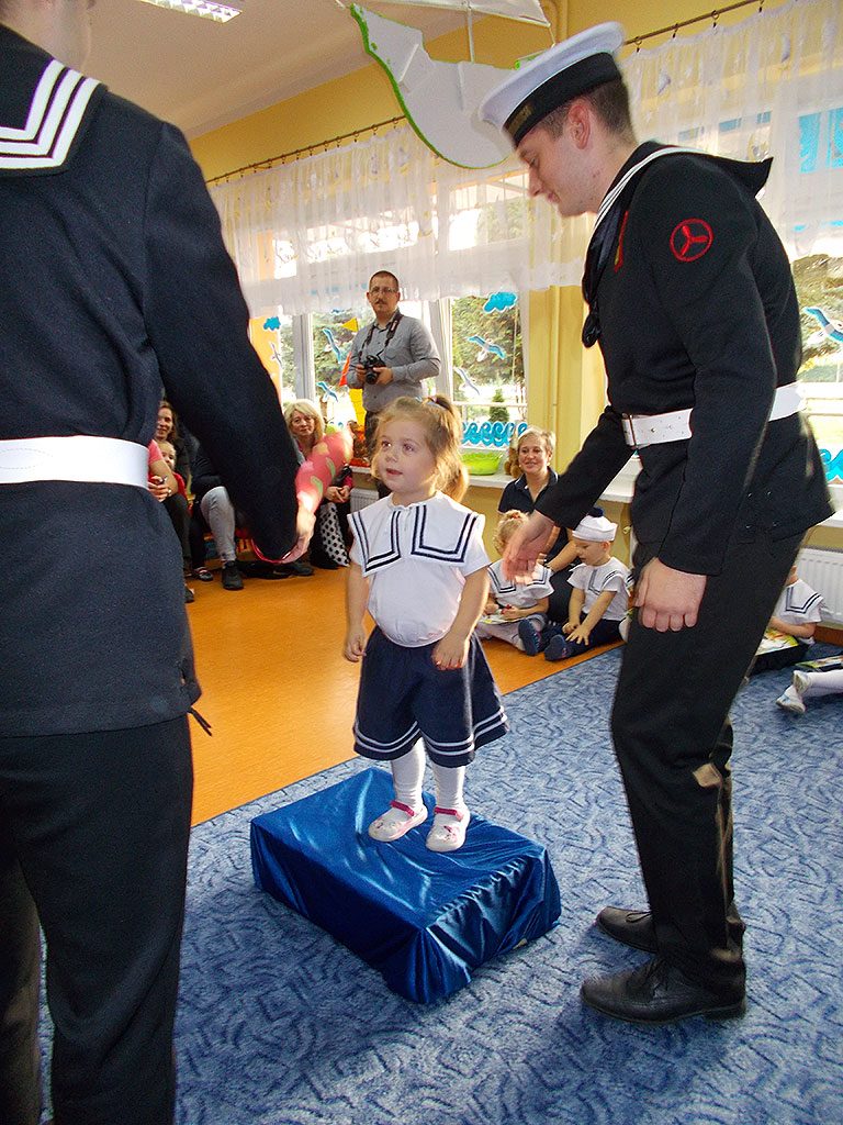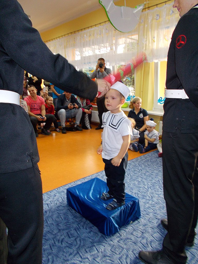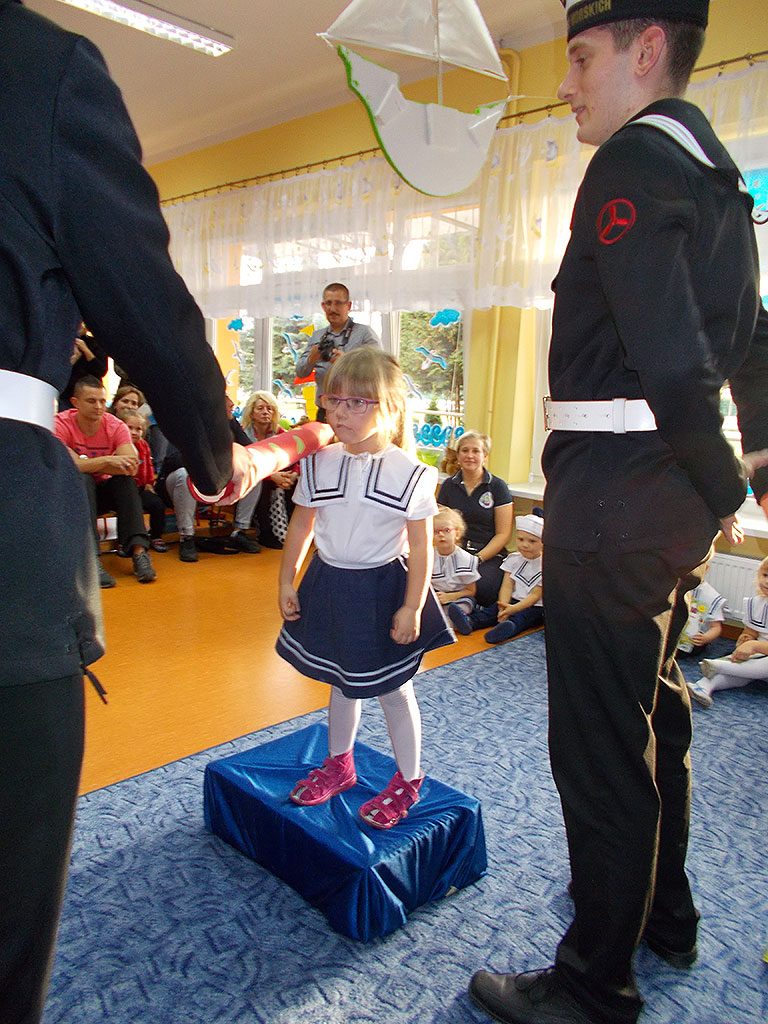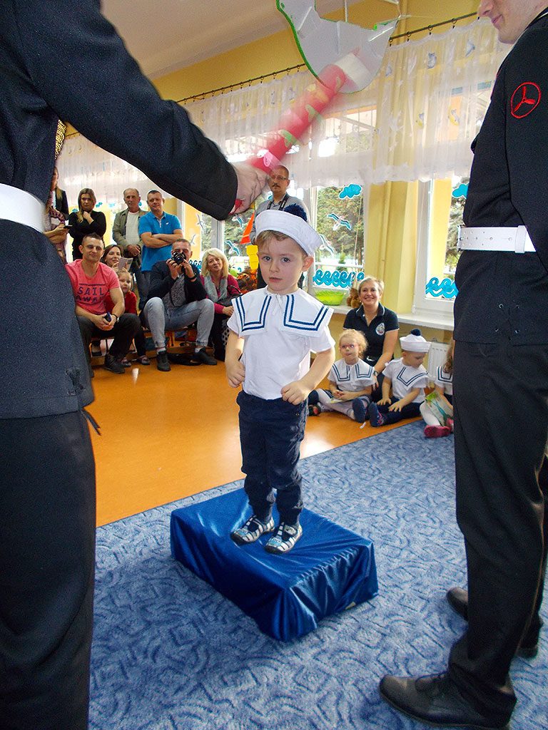 Uroczystość rozpoczęła się od powitania gości i przedstawienia części artystycznej, (piosenki, wierszyki i tance), w której maluszki zaprezentowały swoje umiejętności – dając tym samym dowód, jak dużo już potrafią. Następnie goście z Zespołu Szkół Morskich dokonali uroczystego pasowania każdego dziecka na przedszkolaka.