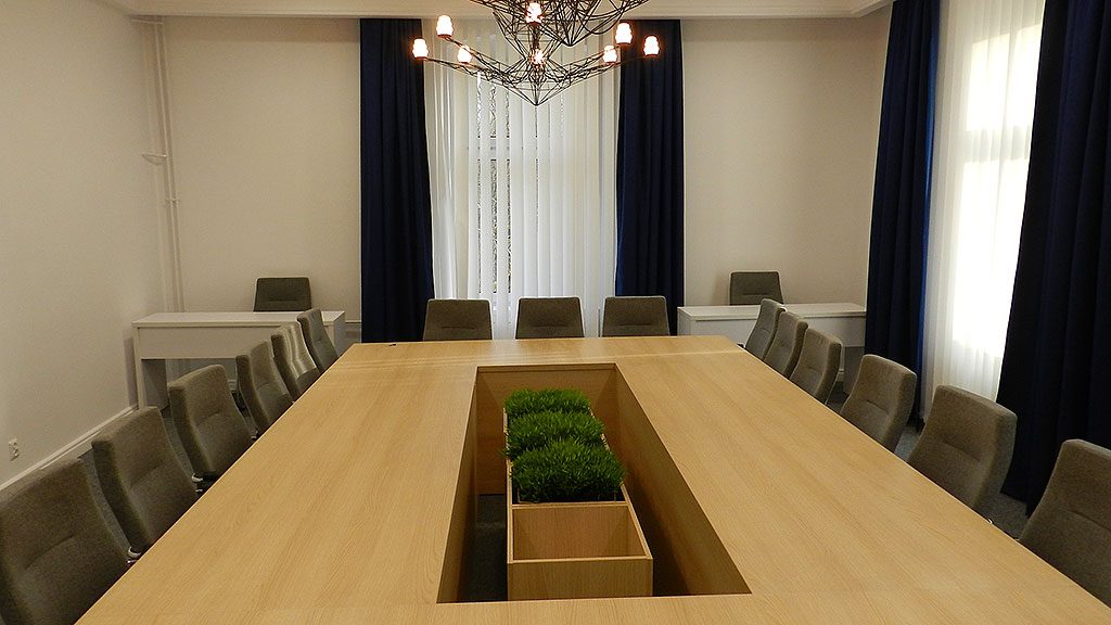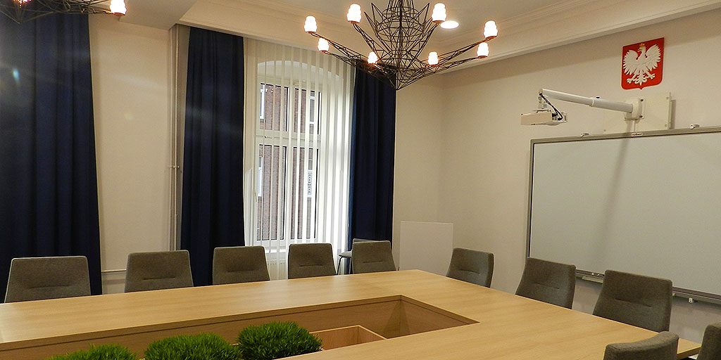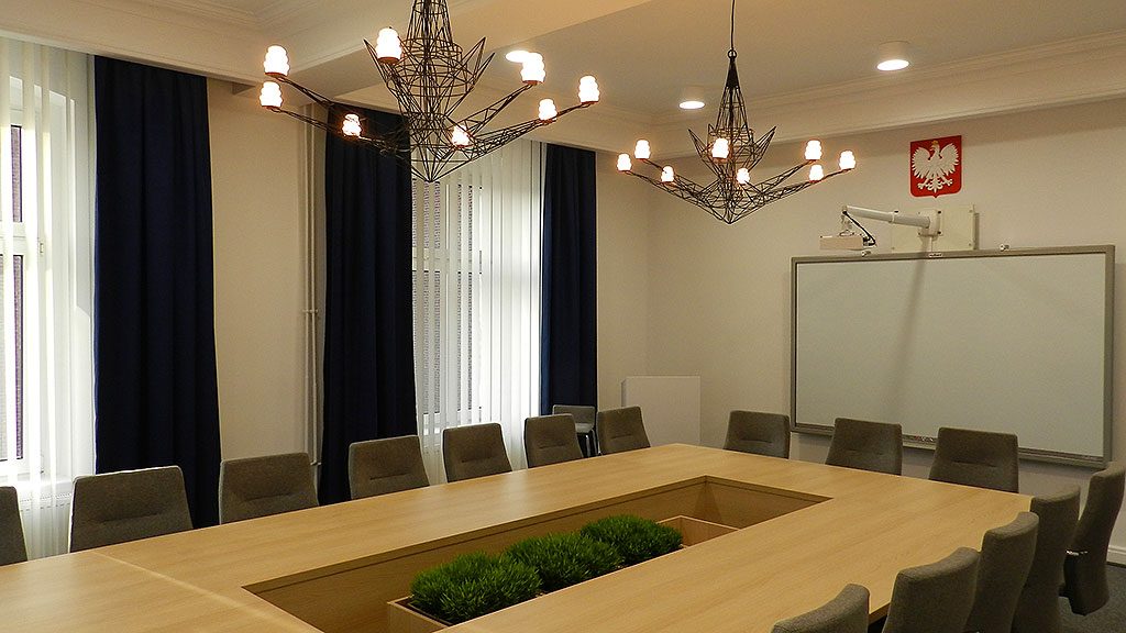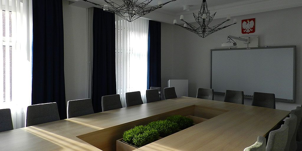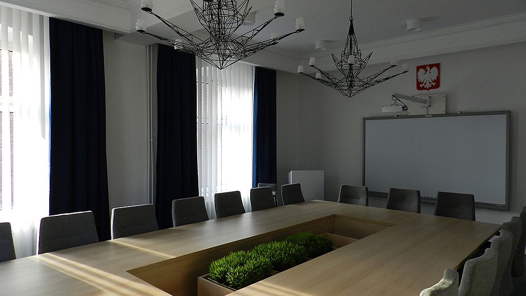 W ramach remontu sali konferencyjnej wymieniono oświetlenie, wykładzinę, grzejniki, oprawę okien, położono gładź i pomalowano ściany, wymieniono tapicerkę drzwiową i zamontowano nowoczesną tablice multimedialną, zakupiono nowe stoły i fotele.