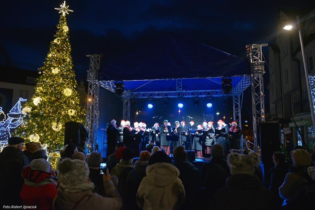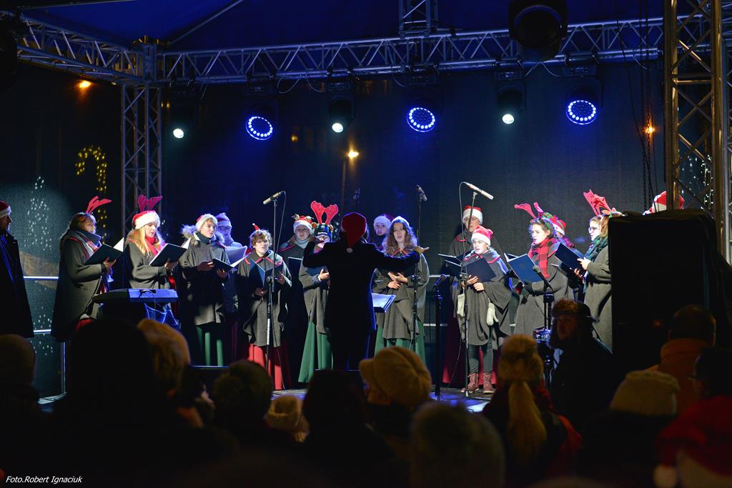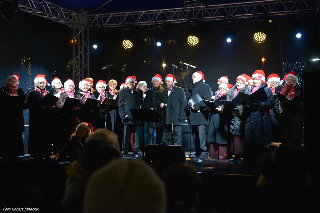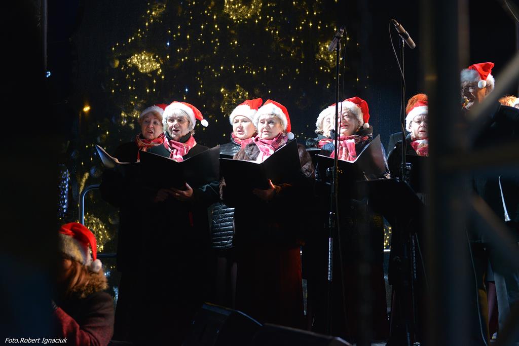 Wcześniej pl. Wolności rozbrzmiewał kolędami. Nie zabrakło „Chwatów” i chóru „Kantylena”. Także miejski chór „Logos” zaśpiewał najpiękniejsze polskie tradycyjne kolędy. Barbara Okoń z MDK rozgrzewała publiczność do wspólnego śpiewania.