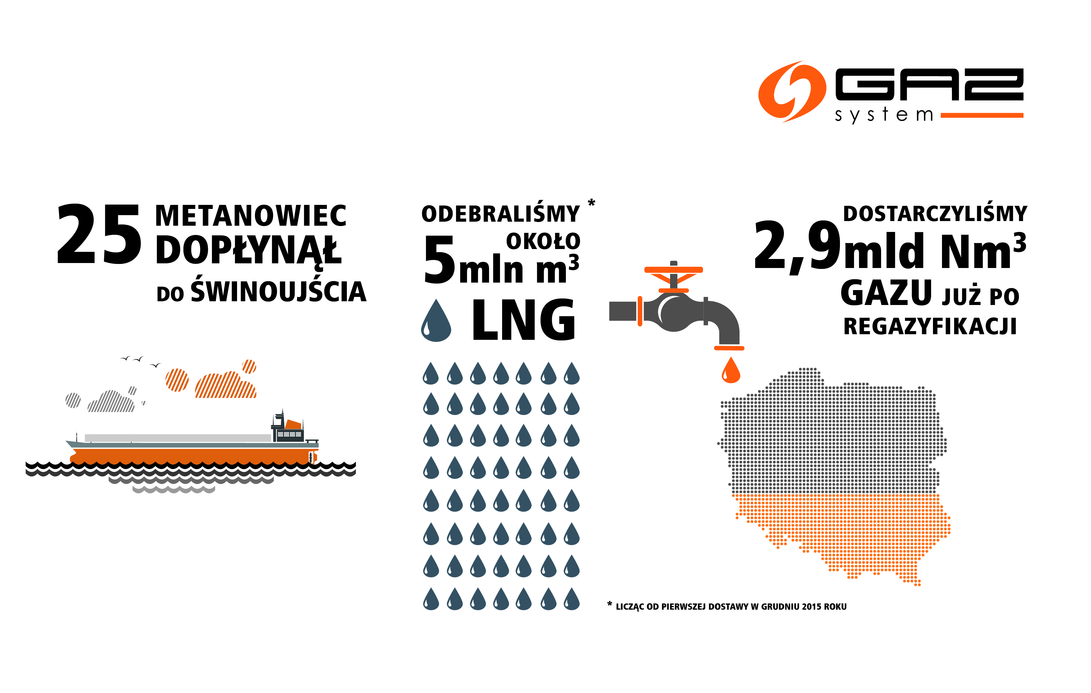 Licząc od pierwszej dostawy, która miała miejsce w grudniu 2015 r., drogą morską do Terminalu im. Prezydenta Lecha Kaczyńskiego w Świnoujściu sprowadzono ponad 5 mln m3 skroplonego gazu ziemnego.